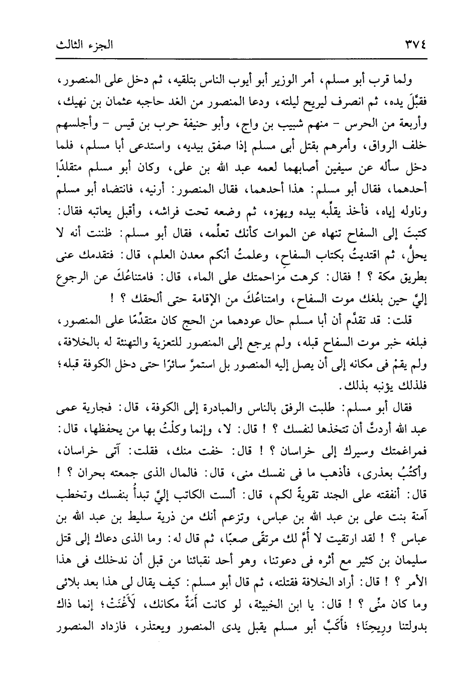 وَلما قرب أَبُو مُسلم أَمر الْوَزير أَبُو أَيُّوب النَّاس بتلقيه ثمَّ دخل على الْمَنْصُور فَقبل يَده ثمَّ انْصَرف ليريح ليلته ودعا الْمَنْصُور من الْغَد حَاجِبه عُثْمَان بن نهيك وَأَرْبَعَة من الحرس مِنْهُم شبيب بن واج وَأَبُو حنيفَة حَرْب بن قيس وأجلسهم خلف الرواق وَأمرهمْ بقتل أبي مُسلم إِذا صفق بيدَيْهِ واستدعى أَبَا مُسلم فَلَمَّا دخل سَأَلَهُ عَن سيفين أصابهما لِعَمِّهِ عبد الله بن عَليّ وَكَانَ أَبُو مُسلم مُتَقَلِّدًا أَحدهمَا فَقَالَ أَبُو مُسلم هَذَا أَحدهمَا فَقَالَ الْمَنْصُور أرنيه فانتضاه أَبُو مُسلم وناوله إِيَّاه فَأخذ يقلبه بِيَدِهِ ويهزه ثمَّ وَضعه تَحت فرَاشه وَأَقْبل يعاتبه فَقَالَ كتبتَ إِلَى السفاح تنهاه عَن الْموَات كَأَنَّك تعلمه فَقَالَ أَبُو مُسلم ظَنَنْت أَنه لَا يحل ثمَّ اقتديتُ بِكِتَاب السفاحِ وعلمتُ أَنكُمْ مَعْدن الْعلم قَالَ فتقدمك عني بطرِيق مَكَّة فَقَالَ كرهت مزاحمتك على المَاء قَالَ فامتناعُكَ عَن الرُّجُوع إِلَيّ حِين بلغك موت السفاح وامتناعك عَن الْإِقَامَة حَتَّى ألحقك قلت قد تقدَم أَن أَبَا مُسلم حَال عودهما من الْحَج كَانَ مُتَقَدما على الْمَنْصُور فَبَلغهُ خبر موت السفاح قبله وَلم يرجع إِلَى الْمَنْصُور للتعزية والتهنئة لَهُ بالخلافة وَلم يقمْ فِي مَكَانَهُ إِلَى أَن يصل إِلَيْهِ الْمَنْصُور بل استمرَّ سائراً حَتَّى دخل الْكُوفَة قبله فَلذَلِك يؤنبه بذلك فَقَالَ أَبُو مُسلم طلبت الرِّفْق بِالنَّاسِ والمبادرة إِلَى الْكُوفَة قَالَ فجارية عمي عبد الله أردتَ أَن تتخذها لنَفسك قَالَ لَا وَإِنَّمَا وكلْتُ بهَا من يحفظها قَالَ فمراغمتك وسيرك إِلَى خُرَاسَان قَالَ خفت مِنْك فَقلت آتِي خُرَاسَان وأكتُبُ بعذري فَأذْهب مَا فِي نَفسك مني قَالَ فَالْمَال الَّذِي جمعته بحران قَالَ أنفقته على الْجند تَقْوِيَة لكم قَالَ أَلَسْت الْكَاتِب إليَّ تبدأُ بِنَفْسِك وتخطب آمِنَة بنت عَليّ بن عبد الله بن عَبَّاس وتزعم أَنَّك من ذُرِّيَّة سليط بن عبد الله بن عَبَّاس لقد ارتقيت لَا أُمَ لَك مرتقى صعبَاً ثمَّ قَالَ لَهُ وَمَا الَّذِي دعَاك إِلَى قتل سُلَيْمَان بن كثير مَعَ أَثَره فِي دَعوتنَا وَهُوَ أحد نقبائنا من قبل أَن ندخلك فِي هَذَا الْأَمر قَالَ أَرَادَ الْخلَافَة فَقتلته ثمَّ قَالَ أَبُو مُسلم كَيفَ يُقَال لي هَذَا بعد بلائي وَمَا كَانَ مني قَالَ يَا ابْن الخبيثة لَو كَانَت أَمَة مَكَانك لأغْنَتْ إِنَّمَا ذَاك بدولتنا وريحنا فأكب أَبُو مُسلم قبل يَدي الْمَنْصُور وَيعْتَذر فازداد الْمَنْصُور