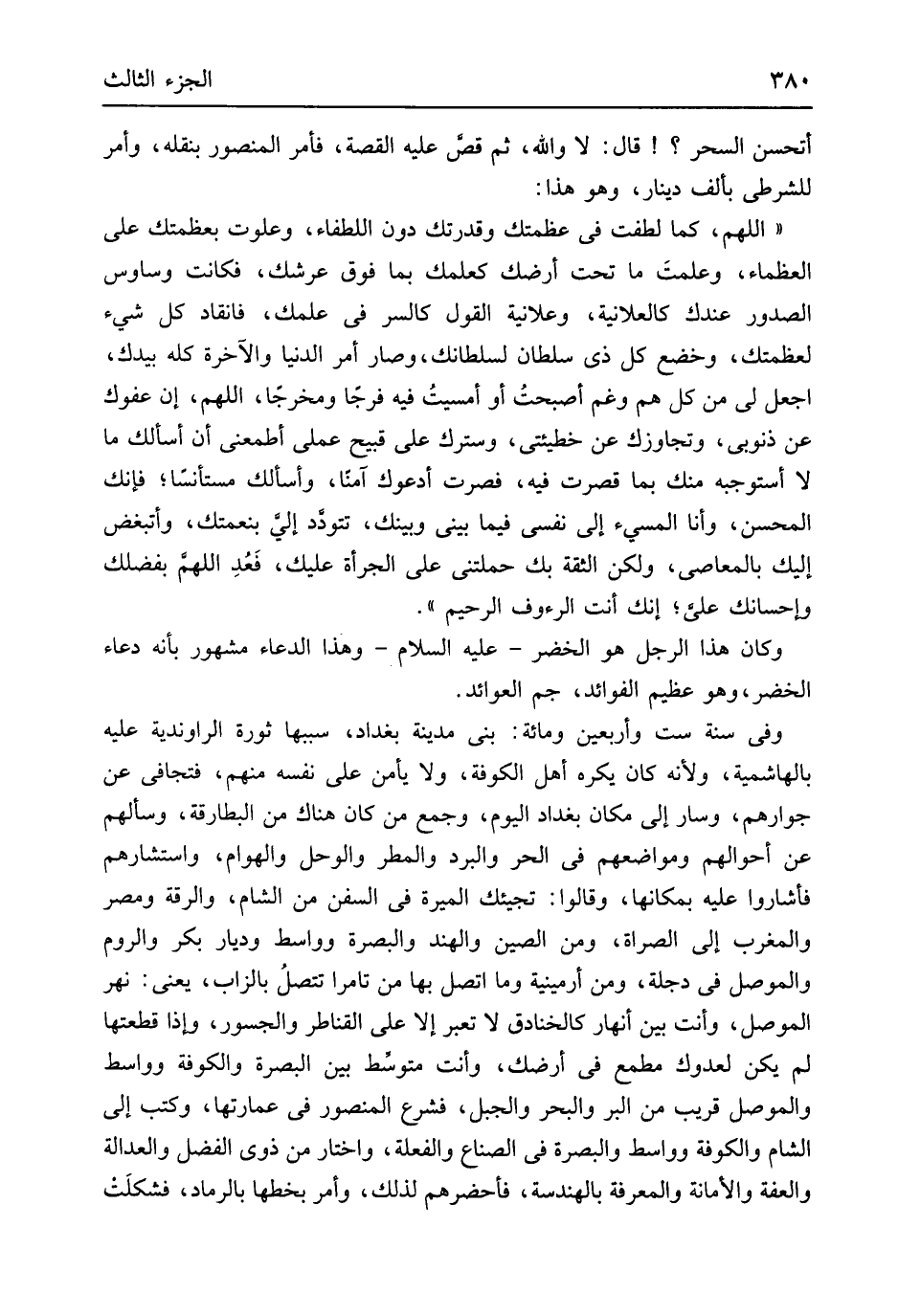 أتحسن السحر قَالَ لَا وَالله ثمَّ قصّ عَلَيْهِ الْقِصَّة فَأمر الْمَنْصُور بنقله وَأمر للشرطي بِأَلف دِينَار وَهُوَ هَذَا اللَّهُمَّ كَمَا لطفت فِي عظمتك وقدرتك دون اللطفاء وعلوت بعظمتك على العظماء وعلمتَ مَا تَحت أَرْضك كعلمك بِمَا فَوق عرشك فَكَانَت وساوس الصُّدُور عنْدك كالعلانية وَعَلَانِيَة القَوْل كالسر فِي علمك فانقاد كل شَيْء لعظمتك وخضع كل ذِي سُلْطَان لسلطانك وَصَارَ أَمر الدُّنْيَا وَالْآخِرَة كُله بِيَدِك اجْعَل لي من كل هم وغم أصبحتُ أَو أمسيتُ فِيهِ فرجَاً ومخرجاً اللَّهُمَّ إِن عفوك عَن ذُنُوبِي وتجاوزك عَن خطيئتي وسترك على قَبِيح عَمَلي أطمعني أَن أَسأَلك مَا لَا أستوجبه مِنْك بهما قصرت فِيهِ فصرت أَدْعُوك آمنَاً وَأَسْأَلك مستأنساً فَإنَّك المحسن وَأَنا الْمُسِيء إِلَى نَفسِي فِيمَا بيني وَبَيْنك تتودد إليَ بنعمتك وأتبغض إِلَيْك بِالْمَعَاصِي وَلَكِن الثِّقَة بك حَملتنِي على الجرأة عَلَيْك فَعُدِ اللَّهُمَّ بِفَضْلِك وإحسانك عَليّ إِنَّك أَنْت الرءوف الرَّحِيم وَكَانَ هَذَا الرجل هُوَ الْخضر عَلَيْهِ السَّلَام وَهَذَا الدُّعَاء مَشْهُور بِأَنَّهُ دُعَاء الْخضر وَهُوَ عَظِيم الْفَوَائِد جم العوائد وَفِي سنة سِتّ وَأَرْبَعين وَمِائَة بني مَدِينَة بَغْدَاد سَببهَا ثورة الرواندية عَلَيْهِ بالهاشمية وَلِأَنَّهُ كَانَ يكره أهل الْكُوفَة وَلَا يَأْمَن على نَفسه مِنْهُم فتجافى عَن جوارهم وَسَار إِلَى مَكَان بَغْدَاد الْيَوْم وَجمع من كَانَ هُنَاكَ من البطارقة وسألهم عَن أَحْوَالهم ومواضعهم فِي الْحر وَالْبرد والمطر والوحل والهوام واستشارهم فأشاروا عَلَيْهِ بمكانها وَقَالُوا تجيئك الْميرَة فِي السفن من الشَّام والرقة ومصر وَالْمغْرب إِلَى الصراة وَمن الصين والهند وَالْبَصْرَة وواسط وديار بكر وَالروم والموصل فِي دجلة وَمن أرمينية وَمَا اتَّصل بهَا من تامراً تتصلُ بالزاب يَعْنِي نهر الْموصل وَأَنت بَين أَنهَار كالخنادق لَا تعبر إِلَّا على القناطر والجسور وَإِذا قطعتها لم يكن لعدوك مطمع فِي أَرْضك وَأَنت متوسط بَين الْبَصْرَة والكوفة وواسط والموصل قريب من الْبر وَالْبَحْر والجبل فشرع الْمَنْصُور فِي عمارتها وَكتب إِلَى الشَّام والكوفة وواسط وَالْبَصْرَة فِي الصناع والفعلة وَاخْتَارَ من ذَوي الْفضل وَالْعَدَالَة والعفة وَالْأَمَانَة والمعرفة بالهندسة فأحضرهم لذَلِك وَأمر بخطها بالرماد فشكلَت