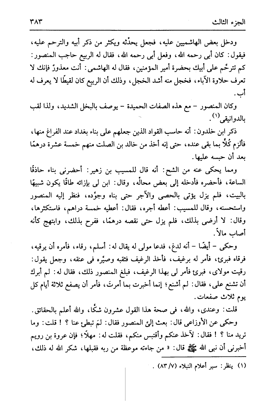 وَدخل بعض الهاشميين عَلَيْهِ فَجعل يحدثه وَيكثر من ذكر أَبِيه والترحم عَلَيْهِ فَيَقُول كَانَ أبي رَحمَه الله وَفعل أبي رَحمَه الله فَقَالَ لَهُ الرّبيع حَاجِب الْمَنْصُور كم تترحَم على أَبِيك بِحَضْرَة أَمِير الْمُؤمنِينَ فَقَالَ لَهُ الْهَاشِمِي أَنْت مَعْذُور فَإنَّك لَا تعرف حلاوة الْآبَاء فَخَجِلَ مِنْهُ أَشد الخجل وَذَلِكَ أَن الرّبيع كَانَ لقيطاً لَا يعرف لَهُ أَب وَكَانَ الْمَنْصُور مَعَ هَذِه الصِّفَات الحميدة يُوصف بالبخل الشَّديد وَلذَا لقب بالدوانيقي ذكر ابْن خلدون أَنه حاسب القواد الَّذين جعلهم على بِنَاء بَغْدَاد عِنْد الْفَرَاغ مِنْهَا فألزم كُلاًَ بِمَا بَقِي عِنْده حَتَّى إِنَّه أَخذ من خَالِد بن الصَّلْت مِنْهُم خَمْسَة عشرَة درهما بعد أَن حَبسه عَلَيْهَا وَمِمَّا يحْكى عَنهُ من الشُّح أَنه قَالَ للمسيب بن زُهَيْر أحضرني بِنَاء حاذقاً السَّاعَة فَأحْضرهُ فَأدْخلهُ إِلَى بعض محاله وَقَالَ ابْن لي بازائه طاقاً يكون شَبِيها بِالْبَيْتِ فَلم يزل يُؤْتِي بالحصى والآجر حَتَّى بناه وجوده فَنظر إِلَيْهِ الْمَنْصُور وَاسْتَحْسنهُ وَقَالَ للمسيب أعْطه أجره فَقَالَ أعْطِيه خَمْسَة دَرَاهِم فاستكثرها وَقَالَ لَا أرضي بذلك فَلم يزل حَتَّى نَقصه درهما ففرح بذلك وابتهج كَأَنَّهُ أصَاب مَالا وَحكي أَيْضا أَنه لدغ فَدَعَا مولى لَهُ يُقَال لَهُ أسلم رقاء فَأمره أَن يرقيه فرقاه فبرئ فَأمر لَهُ برغيف فَأخذ الرَّغِيف فثقبه وصيره فِي عُنُقه وَجعل يَقُول رقيت مولَايَ فبرئ فَأمر لي بِهَذَا الرَّغِيف فَبلغ الْمَنْصُور ذَلِك فَقَالَ لَهُ لم أبرك أَن تشنع عَليّ فَقَالَ لم أشنع إِنَّمَا أخْبرت بِمَا أمرتَ فَأمر أَن يصفع ثَلَاث أَيَّام كل يَوْم ثَلَاث صفعات قلت وَعِنْدِي وَالله فِي صِحَة هَذَا القَوْل عشرُون شكا وَالله أعلم بالحقائق وَحكي عَن الْأَوْزَاعِيّ قَالَ بعث إِلَيّ الْمَنْصُور فَقَالَ لم تبطئ عَنْهَا قلت وَمَا تُرِيدُ منا فَقَالَ لآخذ عَنْكُم وأقتبس مِنْكُم فَقلت لَهُ مهلا فَإِن عُرْوَة بن رُوَيْم أَخْبرنِي أَن نَبِي الله