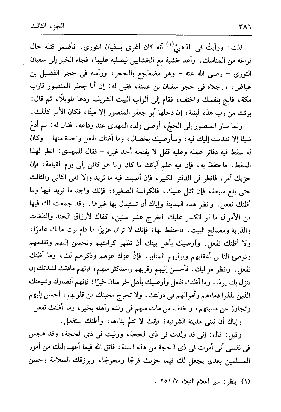 قلت ورأيتُ فِي الذَّهَبِيّ أَنه كَانَ أغرى بسفيان وَالثَّوْري فَأمر قَتله حَال فَرَاغه من الْمَنَاسِك وَأعد خَشَبَة مَعَ الخشابين ليصلبه عَلَيْهَا فجَاء الْخَبَر إِلَى سُفْيَان الثَّوْريّ رَضِي الله عَنهُ وَهُوَ فضطجع بِالْحجرِ وَرَأسه فِي حجر الفضيل بن عِيَاض وَرجلَاهُ فِي حجر سُفْيَان بن عُيَيْنَة فَقيل لَهُ إِن أَبَا جَعْفَر الْمَنْصُور قَارب مَكَّة فَانْجُ بِنَفْسِك واختفِ فَقَامَ إِلَى أَثوَاب الْبَيْت الشريف ودعا طَويلا ثمَّ قَالَ بَرِئت من رب هَذِه الْبَيِّنَة إِن دَخلهَا أَبُو جَعْفَر الْمَنْصُور إِلَّا مَيتا فَكَانَ الْأَمر كَذَلِك وَلما سَار الْمَنْصُور إِلَى الْحَج أوصى وَلَده الْمهْدي عِنْد وداعه فَقَالَ لَهُ لم أدع شَيْئا إِلَّا تقدّمت إِلَيْك فِيهِ وسأوصيك بخصال وَمَا أَظُنك تفعل وَاحِدَة مِنْهَا وَكَانَ لَهُ سفط فِيهِ دفاتر عمله وَعَلِيهِ قفل لَا يَفْتَحهُ أحد غَيره فَقَالَ للمهدي انْظُر لهَذَا السفط فاحتفظ بِهِ فَإِن فِيهِ علم آبَائِك مَا كَانَ وَمَا هُوَ كَائِن إِلَى يَوْم الْقِيَامَة فَإِن حزبك أَمر فَانْظُر فِي الدفتر الْكَبِير فَإِن أصبت فِيهِ مَا تُرِيدُ وَإِلَّا فَفِي الثَّانِي وَالثَّالِث حَتَّى بلغ سَبْعَة فَإِن ثقل عَلَيْك فالكراسة الصَّغِيرَة فَإنَّك وَاجِد مَا تُرِيدُ فِيهَا وَمَا أَظُنك تفعل وَانْظُر هَذِه الْمَدِينَة وَإِيَّاك أَن تستبدل بهَا غَيرهَا وَقد جمعت لَك فِيهَا من الْأَمْوَال مَا لَو انْكَسَرَ عَلَيْك الْخراج عشر سِنِين كَفاك لأرزاق الْجند والنفقات والذرية ومصالح الْبَيْت فاحتفظ بهَا فَإنَّك لَا تزَال عَزِيزًا مَا دَامَ بَيت مَالك عَامِرًا وَلَا أَظُنك تفعل وأوصيك بِأَهْل بَيْتك أَن تظهر كرامتهم وتحسن إِلَيْهِم وتقدمهم وتوطئ النَّاس أَعْقَابهم وتوليهم المنابر فَإِن عزك عزهم وَذكرهمْ لَك وَمَا أَظُنك تفعل وَانْظُر مواليك فَأحْسن إِلَيْهِم وقربهم واستكثر مِنْهُم فَإِنَّهُم مادتك لشدتَك إِن تنزل بك يومَاً وَمَا أَظُنك تفعل وأوصيك بِأَهْل خرسان خيرَاً فَإِنَّهُم أنصارك وشيعتك الَّذين بذلوا دِمَاءَهُمْ وَأَمْوَالهمْ فِي دولتك وَلَا تخرج محبتك من قُلُوبهم أحسن إِلَيْهِم وَتجَاوز عَن مسيئهم واخلف من مَاتَ فِي وَلَده وَأَهله بِخَير وَمَا أَظُنك تفعل وَإِيَّاك أَن تبني مَدِينَة الشرقية فَإنَّك لَا تتمّ بناءها وأظنك ستفعل وَقيل قَالَ إِنِّي قد ولدت فِي ذِي الْحجَّة وَوليت فِي ذِي الْحجَّة وَقد هجس فِي نَفسِي أَنِّي أَمُوت فِي ذِي الْحجَّة من هَذِه السّنة فَاتق الله فِيمَا أَعهد إِلَيْك من أُمُور الْمُسلمين بعدِي يَجْعَل لَك فِيمَا جزبك فرجَاً ومخرجاً ويرزقك السَّلامَة وَحسن