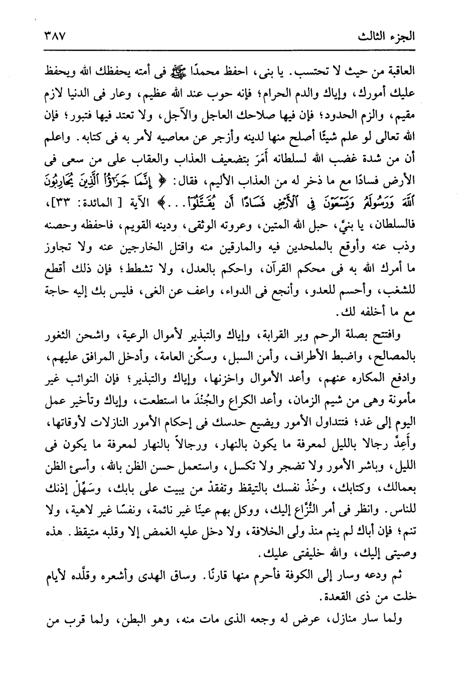 فِي أمته يحفظك الله ويحفظ عَلَيْك أمورك وَإِيَّاك وَالدَّم الْحَرَام فَإِنَّهُ حوب عِنْد الله عَظِيم وعار فِي الدُّنْيَا لَازم مُقيم والزم الْحُدُود فَإِن فِيهَا صلاحك العاجل والآجل وَلَا تَعْتَد فِيهَا فتبور فَإِن الله تَعَالَى لَو علم شَيْئا أصلح مِنْهَا لدينِهِ وأزجر عَن مَعَاصيه لأمر فِي كِتَابه وَاعْلَم أَن من شدَّة غضب الله لسلطانه أَمَرَ بِتَضْعِيف الْعَذَاب وَالْعِقَاب على من سعى فِي الأَرْض فَسَادًا مَعَ مَا ذخر لَهُ من الْعَذَاب الْأَلِيم فَقَالَ {إِنَمَا جزؤا الذَّينَ يُحَارِبونَ اللَّهَ وَرَسُولَه وَيسَعونَ فِي اَلأرَضِ فَسَاداً أَن يُقَتَّلوا} الْآيَة الْمَائِدَة 33 فالسلطان يَا بني حَبل الله المتين وعروته الوثقى وَدينه القويم فاحفظه وحصنه وذب عَنهُ وأوقع بالملحدين فِيهِ والمارقين مِنْهُ واقتل الخارجين عَنهُ وَلَا تجَاوز مَا أَمرك الله بِهِ فِي مُحكم الْقُرْآن واحكم بِالْعَدْلِ وَلَا تشطط فَإِن ذَلِك أقطع للشغب وأحسم لِلْعَدو وأنجع فِي الدَّوَاء واعف عَن الغي فَلَيْسَ بك إِلَيْهِ حَاجَة مَعَ مَا أخلفه لَك وافتتح بصلَة الرَّحِم وبر القَرابة وَإِيَّاك والتبذير لأموال الرّعية واشحن الثغور بالمصالح واضيط الْأَطْرَاف وَأمن السبل وسكِّن الْعَامَّة وَأدْخل الْمرَافِق عَلَيْهِم وادفع المكاره عَنْهُم وَأعد الْأَمْوَال واخزنها وَإِيَّاك والتبذير فَإِن النوائب غير مَأْمُونَة وَهِي من شيم الزَّمَان وَأعد الكراع والجُنْدَ مَا اسْتَطَعْت وَإِيَّاك وَتَأْخِير عمل الْيَوْم إِلَى غَد فتتداول الْأُمُور ويضيع حدسك فِي إحكام الْأُمُور النازلات لأوقاتها وَأعد رجلا بِاللَّيْلِ لمعْرِفَة مَا يكون بِالنَّهَارِ ورجلا بِالنَّهَارِ لمعْرِفَة مَا يكون فِي اللَّيْل وباشر الْأُمُور وَلَا تضجر وَلَا تكسل وَاسْتعْمل حسن الظَّن بِاللَّه وأسئ الظَّن بعمالك وكتابك وخُذ نَفسك بالتيقظ وتفقد من يبيت على بابك وسَهلْ إذنك للنَّاس وَانْظُر فِي أَمر النزاع إِلَيْك ووكل بهم عينا غير نَائِمَة ونفساً غير لاهية وَلَا تنم فَإِن أَبَاك لم ينم مُنْذُ ولي الخلافةَ وَلَا دخل عَلَيْهِ الغمض إِلَّا وَقَلبه متيقظ هَذِه وصيتي إِلَيْك وَالله خليفتي عَلَيْك ثمَّ ودعه وَسَار إِلَى الْكُوفَة فَأحْرم مِنْهَا قارنَاً وسَاق الْهدى وَأَشْعرهُ وقلَّده لأيام خلت من ذِي الْقعدَة وَلما سَار منَازِل عرض لَهُ وَجَعه الَّذِي مَاتَ مِنْهُ وَهُوَ الْبَطن وَلما قرب من