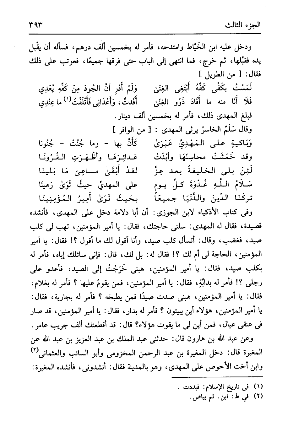 فَبلغ الْمهْدي ذَلِك فَأمر لَهُ بِخَمْسِينَ ألف دِينَار وَقَالَ سَلم الخاسرُ يرثي الْمهْدي من // (الوافر) //