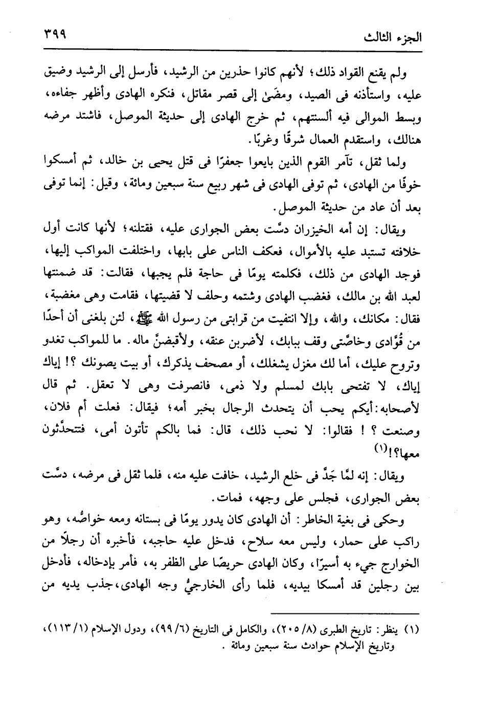 وَلم يقنع القواد ذَلِك لأَنهم كَانُوا حذرين من الرشيد فَأرْسل إِلَى الرشيد وضيق عَلَيْهِ واستأذنه فِي الصَّيْد ومضَى إِلَى قصر مقَاتل فنكره الْهَادِي وَأظْهر جفاءه وَبسط الموَالِي فِيهِ ألسنتهم ثمَّ خرج الْهَادِي إِلَى حَدِيثَة الْموصل فَاشْتَدَّ مَرضه هُنَالك واستقدم الْعمَّال شرقاً وغرباً وَلما ثقل تآمر الْقَوْم الَّذين بَايعُوا جعفراً فِي قتل يحيى بن خَالِد ثمَّ أَمْسكُوا خوفًا من الْهَادِي ثمَّ توفّي الْهَادِي فِي شهر ربيع سنة سبعين وَمِائَة وَقيل إِنَّمَا توفّي بعد أَن عَاد من حَدِيثَة الْموصل وَيُقَال إِن أمه الخيزران دست بعض الْجَوَارِي عَلَيْهِ فقتلنه لِأَنَّهَا كَانَت أول خِلَافَته تستبد عَلَيْهِ بالأموال فعكف النَّاس على بَابهَا وَاخْتلف المواكب إِلَيْهَا فَوجدَ الْهَادِي من ذَلِك فكلمته يَوْمًا فِي حَاجَة فَلم يجبها فَقَالَت قد ضمنتها لعبد الله بن مَالك فَغَضب الْهَادِي وَشَتمه وَحلف لَا قضيتها فَقَامَتْ وَهِي مغضبة فَقَالَ مَكَانك وَالله وَإِلَّا انتفيت من قَرَابَتي من رَسُول الله