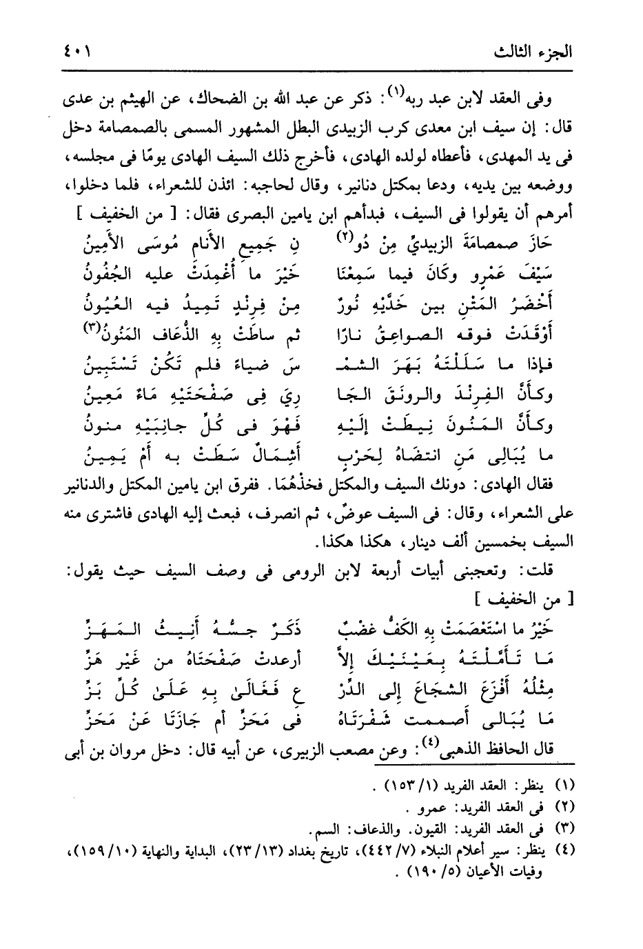 فَقَالَ الْهَادِي دُونك السَّيْف والمكَتل فخذْهُمَا فَفرق ابْن يَامِين المكتل وَالدَّنَانِير على الشُّعَرَاء وَقَالَ فِي السَّيْف عوضْ ثمَّ انْصَرف فَبعث إِلَيْهِ الْهَادِي فَاشْترى مِنْهُ السَّيْف بِخَمْسِينَ ألف دِينَار هَكَذَا هَكَذَا قلت وتعجبني أَبْيَات أَرْبَعَة لِابْنِ الرُّومِي فِي وصف السَّيْف حَيْثُ يَقُول من // (الْخَفِيف) //