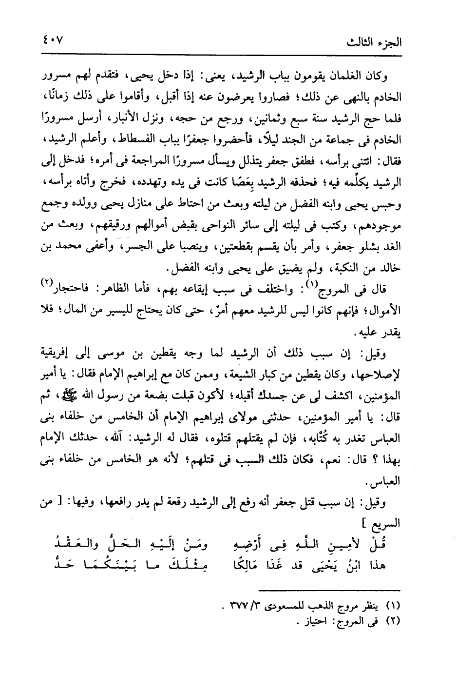 ثمَّ قَالَ يَا أَمِير الْمُؤمنِينَ حَدثنِي مولَايَ إِبْرَاهِيم الإِمَام أَن الْخَامِس من الْخُلَفَاء بني الْعَبَّاس تعذر بِهِ كُتابه فَإِن لم يقتلهُمْ قَتَلُوهُ فَقَالَ لَهُ الرشيد الله حَدثَك الإِمَام بِهَذَا قَالَ نعم فَكَانَ ذَلِك السَّبَب فِي قَتلهمْ لِأَنَّهُ هُوَ الْخَامِس من خلفاء بني الْعَبَّاس وَقيل إِن سَبَب قتل جَعْفَر أَنه رفع إِلَى الرشيد رقْعَة لم يدر رافعها وفيهَا من // (السَّرِيع) //
