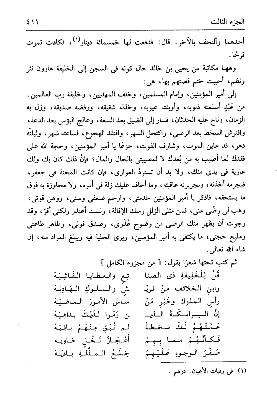 أَحدهمَا وألتحف بِالْآخرِ قَالَ فَدفعت لَهَا خَمْسمِائَة دِينَار فَكَادَتْ تَمُوت فَرحا وَهَهُنَا مُكَاتبَة من يحيى بن خَالِد حَال كَونه فِي السجْن إِلَى الْخَلِيفَة هَارُون نثر ونظم أَحْبَبْت ختم قصتهم بهَا هِيَ إِلَى أَمِير الْمُؤمنِينَ وَإِمَام الْمُسلمين وَخلف المهديين وَخَلِيفَة رب الْعَالمين من عَبْدٍ أسلمته ذنُوبه وأوبقته عيوبه وخذله شقيقه ورفضه صديقه وَنزل بِهِ الزَّمَان وناح عَلَيْهِ الْحدثَان فَسَار إِلَى الضّيق بعد السعَة وعالج الْبُؤْس بعد الدعة وافترش السخط بعد الرضى واكتحل السهر وافتقد الهجوع فساعته شهر وَلَيْلَته دهر قد عاين الْمَوْت وشارف الْفَوْت جزعاً يَا أَمِير الْمُؤمنِينَ وَحجَّة الله على فقدك لما أُصِيب بِهِ من بُعدك لَا لمصيبتى بِالْحَال وَالْمَال فَإِن ذَلِك كَانَ بك وَلَك عَارِية فِي يَدي مِنْك وَلَا بُد أَن تسترد العواري فَإِن كَانَت المحنة فِي جَعْفَر فبجرمه أَخَذته وبجريرته عاقبته وَمَا أَخَاف عَلَيْك زلَّة فِي أمره وَلَا مُجَاوزَة بِهِ فَوق مَا يسْتَحقّهُ فاذكر يَا أَمِير الْمُؤمنِينَ خدمتي وَارْحَمْ ضعْفي وسني ووهن قوتي وهب لي رضى عني فَمن مثلي الزلل ومنك الْإِقَالَة وَلست أعْتَذر وَلَكِنِّي أقرّ وَقد رَجَوْت أَن يظْهر مِنْك الرضى من وضوح عُذري وَصدق قولي وَظَاهر طَاعَتي ومليح حجتي مَا يَكْتَفِي بِهِ أَمِير الْمُؤمنِينَ وَيرى الجلية فِيهِ ويبلغ المُرَاد مِنْهُ إِن شَاءَ الله تَعَالَى ثمَّ كتب تحتهَا شعرًا يَقُول من // (مجزوء الْكَامِل) //