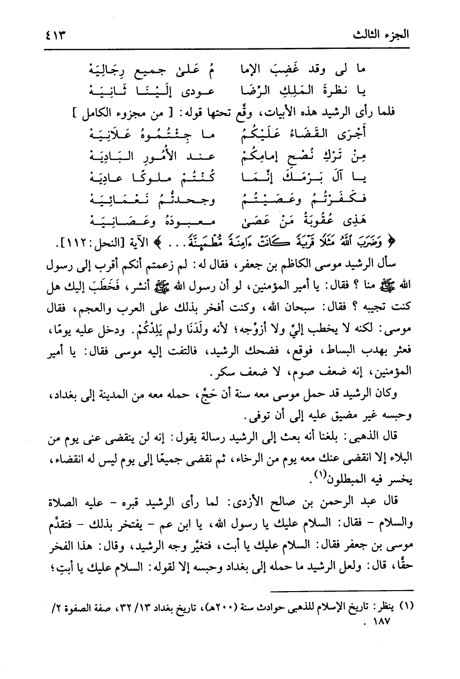 {وضرَبَ اَللَهُ مَثَلا قَرية كَانتَ آمِنَة مُطمَئنَةَ} الْآيَة النَّحْل 112 سَأَلَ الرشيد مُوسَى الكاظم بن جَعْفَر فَقَالَ لَهُ لم زعمتم أَنكُمْ أقرب إِلَى رَسُول الله