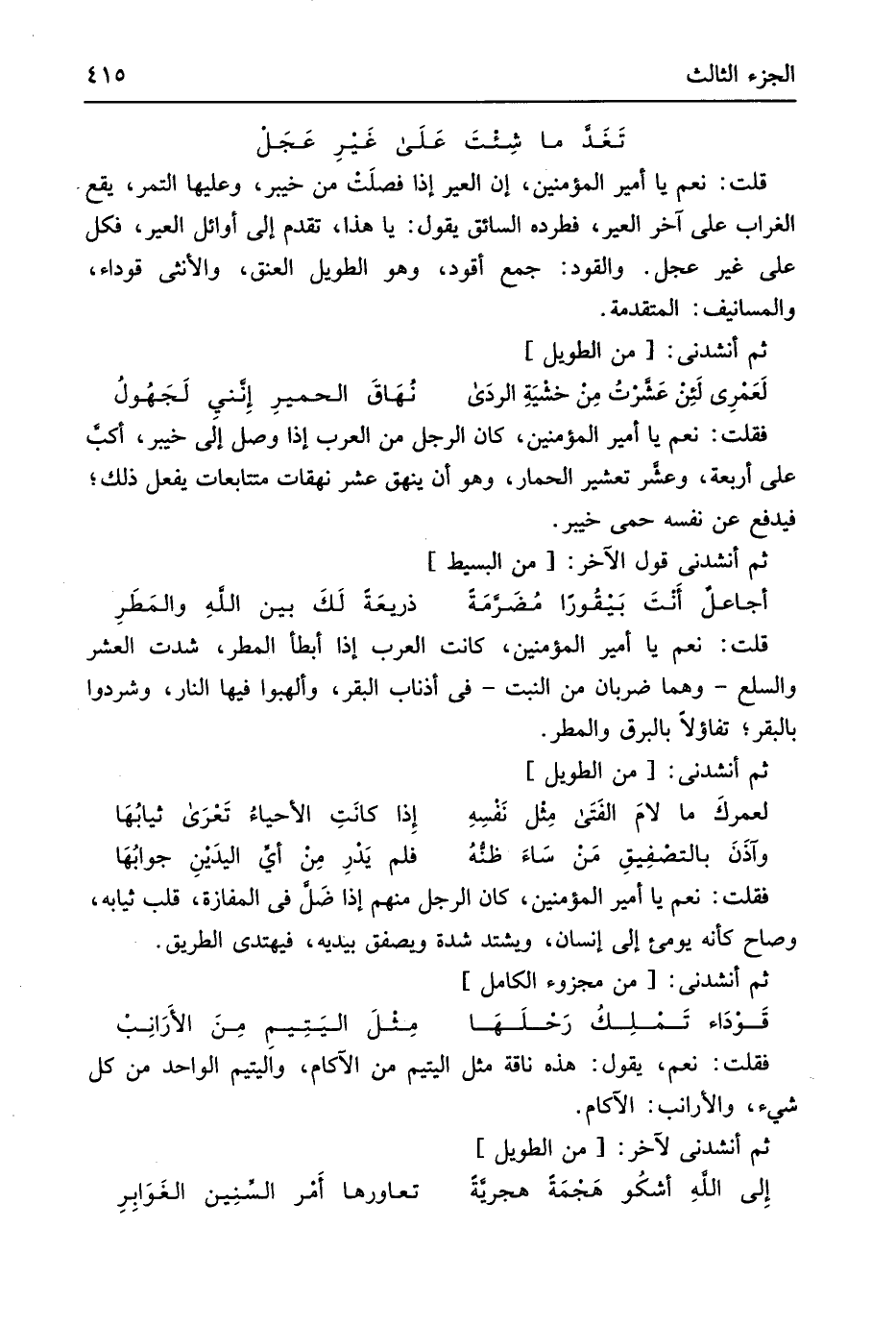فَقلت نعم يَا أَمِير الْمُؤمنِينَ كَانَ الرجل مِنْهُم إِذا ضَل فِي الْمَفَازَة قلب ثِيَابه وَصَاح كَأَنَّهُ يُومِئ إِلَى إِنْسَان ويشتد شدَّة ويصفق بيدَيْهِ فيهتدي الطَّرِيق ثمَّ أَنْشدني من // (مجزوء الْكَامِل) //
