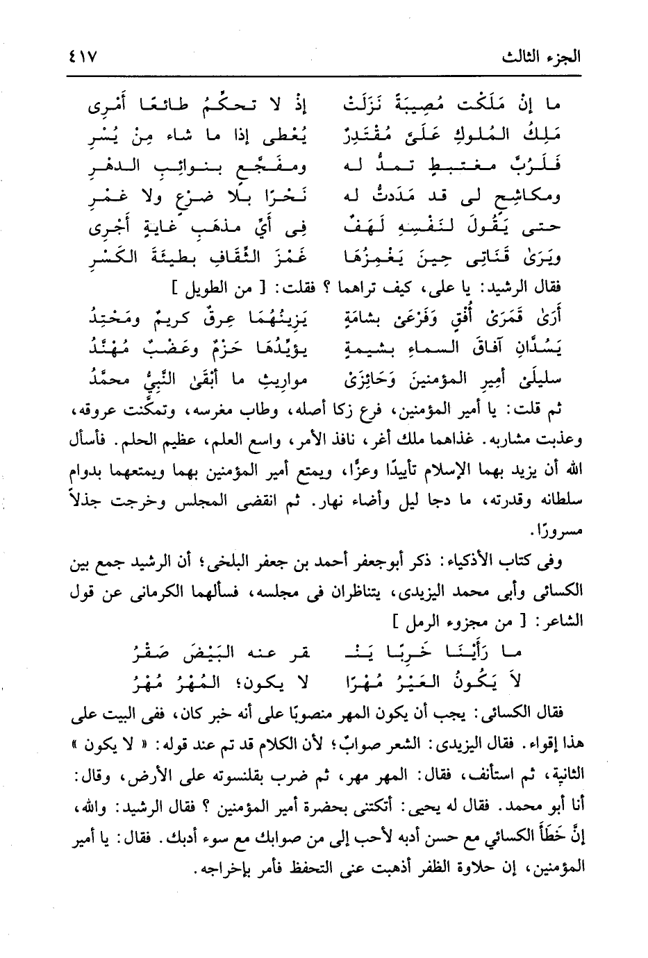 ثمَّ قلت يَا أَمِير الْمُؤمنِينَ فرع زكا أَصله وطاب مغرسه وتمكَنت عروقه وعذبت مشاربه غذاهما ملك أغر نَافِذ الْأَمر وَاسع الْعلم عَظِيم الْحلم فأسأل الله أَن يزِيد بهما الْإِسْلَام تأييدَاً وَعزا ويمتع أَمِير الْمُؤمنِينَ بهما ويمتعهما بدوام سُلْطَانه وَقدرته مَا دجا ليل وأضاء نَهَار ثمَّ انْقَضى الْمجْلس وَخرجت جذلا مَسْرُورا وَفِي كتاب الأذكياء ذكر أَبُو جَعْفَر أَحْمد بن جَعْفَر الْبَلْخِي أَن الرشيد جمع بَين الْكسَائي وَأبي مُحَمَّد اليزيدي يتناظران فِي مَجْلِسه فَسَأَلَهُمَا الْكرْمَانِي عَن قَول الشَّاعِر من // (مجزوء الرمل) //