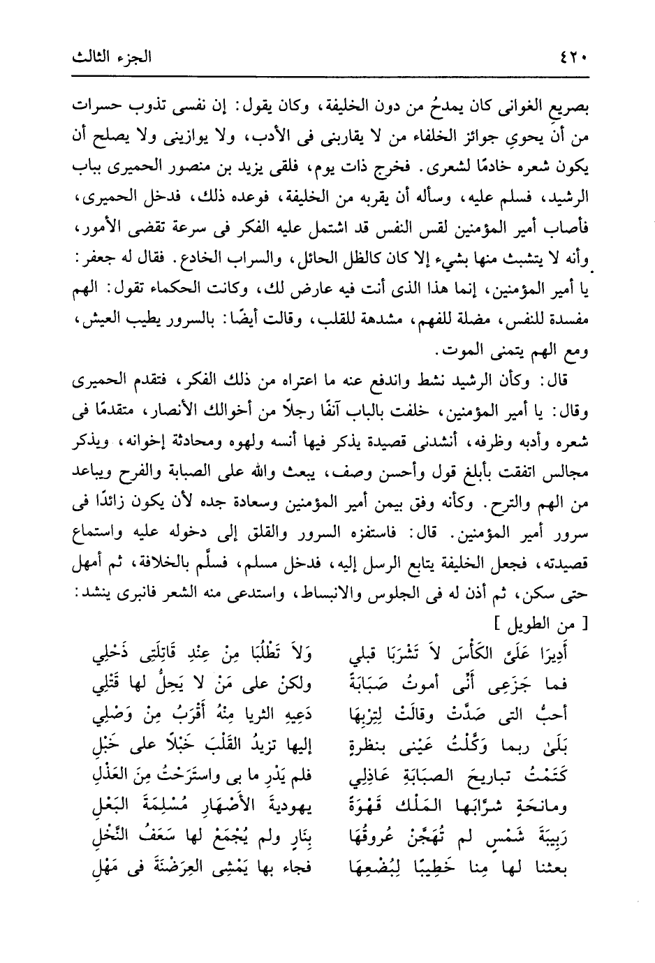 بصريعِ الغواني كَانَ يمدحُ من دون الْخَلِيفَة وَكَانَ يَقُول إِن نَفسِي تذوب حسرات من أَن يحوي جوائز الْخُلَفَاء من لَا يقاربني فِي الْأَدَب وَلَا يوازيني وَلَا يصلح أَن يكون شعره خَادِمًا لشعري فَخرج ذَات يَوْم فلقي يزِيد بن مَنْصُور الْحِمْيَرِي بِبَاب الرشيد فَسلم عَلَيْهِ وَسَأَلَهُ أَن يقربهُ من الْخَلِيفَة فوعده ذَلِك فَدخل الْحِمْيَرِي فَأصَاب أَمِير الْمُؤمنِينَ لقس النَّفس قد اشْتَمَل عَلَيْهِ الْفِكر فِي سرعَة تقضي الْأُمُور وَأَنه لَا يتشبث بِشَيْء لَا كَانَ كالظل الْحَائِل والسراب الخادع فَقَالَ لَهُ جَعْفَر يَا أَمِير الْمُؤمنِينَ إِنَّمَا هَذَا الَّذِي أَنْت فِيهِ عَارض لَك وَكَانَت الْحُكَمَاء تَقول الْهم مفْسدَة للنَّفس مضلة للفهم مشدهة للقلب وَقَالَت أَيْضا بالسرور يطيب الْعَيْش وَمَعَ الْهم يتَمَنَّى الْمَوْت قَالَ وَكَأن الرشيد نشط واندفع عَنهُ مَا اعتراه من ذَلِك الْفِكر فَتقدم الْحِمْيَرِي وَقَالَ يَا أَمِير الْمُؤمنِينَ خلفت بِالْبَابِ اَنفاً رجلا من أخوالك الْأَنْصَار متقدمَاً فِي شعره وأدبه وظرفه أَنْشدني قصيدة يذكر فِيهَا أنسه ولهوه ومحادثة إخوانه وَيذكر مجَالِس اتّفقت بأبلغ قَول وَأحسن وصف يبْعَث وَالله على الصبابة والفرح ويباعد من الْهم والترح وَكَأَنَّهُ وفْق بيمن أَمِير الْمُؤمنِينَ وسعادة جده لِأَن يكون زَائِدا فِي سرُور أَمِير الْمُؤمنِينَ قَالَ فاستفزه السرُور والقلق إِلَى دُخُوله عَلَيْهِ واستماع قصيدته فَجعل الْخَلِيفَة يُتَابع الرُّسُل إِلَيْهِ فَدخل مُسلم فَسلم بالخلافة ثمَّ أمْهل حَتَّى سكن ثمَّ أذن لَهُ فِي الْجُلُوس والانبساط واستدعى مِنْهُ الشّعْر فانبرى ينشد من // (الطَّوِيل) //