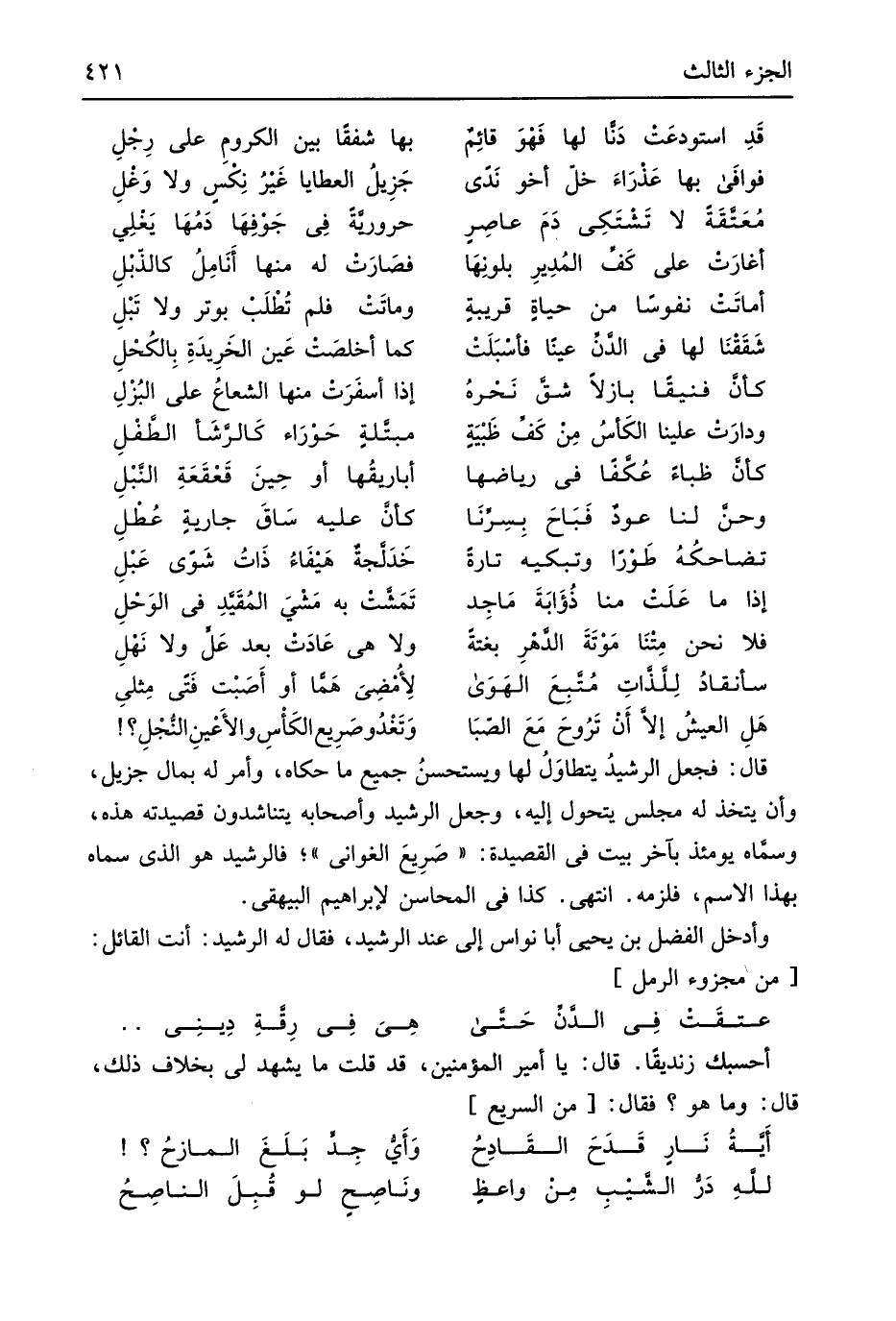 أحسبك زنديقاً قَالَ يَا أَمِير الْمُؤمنِينَ قد قلت مَا يشْهد لي بِخِلَاف ذَلِك قَالَ وَمَا هُوَ فَقَالَ من // (السَّرِيع) //