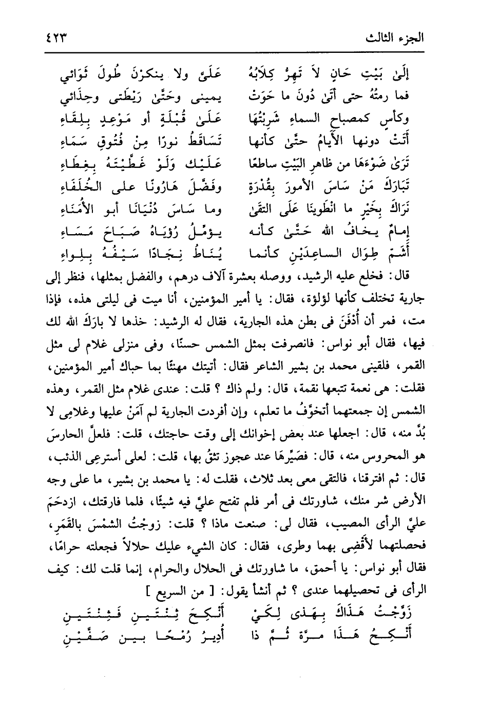 قَالَ فَخلع عَلَيْهِ الرشيد وَوَصله بِعشْرَة آلَاف دِرْهَم وَالْفضل بِمِثْلِهَا فَنظر إِلَى جَارِيَة تخْتَلف كَأَنَّهَا لُؤْلُؤ فَقَالَ يَا أَمِير الْمُؤمنِينَ أَنا ميت فِي لَيْلَتي هَذِه فَإِذا مت فَمر أَن أُدفَنَ فِي بطن هَذِه الْجَارِيَة فَقَالَ لَهُ الرشيد خُذْهَا لَا بارَكَ الله لَك فِيهَا فَقَالَ أَبُو نواس فَانْصَرَفت بِمثل الشَّمْس حسنا وَفِي منزلي غُلَام لي مثل الْقَمَر فلقيني مُحَمَّد بن بشير الشَّاعِر فَقَالَ أَتَيْتُك مهنئاً بِمَا حباك أَمِير الْمُؤمنِينَ فَقلت هِيَ نعْمَة تتبعها نقمة قَالَ وَلم ذَاك قلت عِنْدِي غُلَام مثل الْقَمَر وَهَذِه الشَّمْس إِن جمعتهما أتخوفُ مَا تعلم وَإِن أفردت الْجَارِيَة لم آمَن عَلَيْهَا وغلامِي لَا بُد مِنْهُ قَالَ اجْعَلْهَا عِنْد بعض إخوانك إِلَى وَقت حَاجَتك قلت فَلَعَلَّ الحارسَ هُوَ المحروس مِنْهُ قَالَ فصَيرهَا عِنْد عَجُوز تثقُ بهَا قلت لعَلي أسترعِي الذِّئْب قَالَ ثمَّ افترقنا فَالتقى معي بعد ثَلَاث فَقلت لَهُ يَا مُحَمَّد بن بشير مَا على وَجه الأَرْض شَرّ مِنْك شاورتك فِي أَمر فَلم تفتح عَليّ فِيهِ شَيْئا فَلَمَّا فارقتك ازدحَمَ عليَ الرَّأْي الْمُصِيب فَقَالَ لي صنعت مَاذَا قلت زوجتُ الشمسَ بالقَمَرِ فحصلتهما لأَقضِي بهما وطرى فَقَالَ كَانَ الشَّيْء عَلَيْك حَلَالا فَجَعَلته حَرَامًا فَقَالَ أَبُو نواس يَا أَحمَق مَا شاورتك فِي الْحَلَال وَالْحرَام إِنَّمَا قلت لَك كَيفَ الرَّأْي فِي تحصيلهما عِنْدِي ثمَّ أنشأ يَقُول من // (السَّرِيع) //
