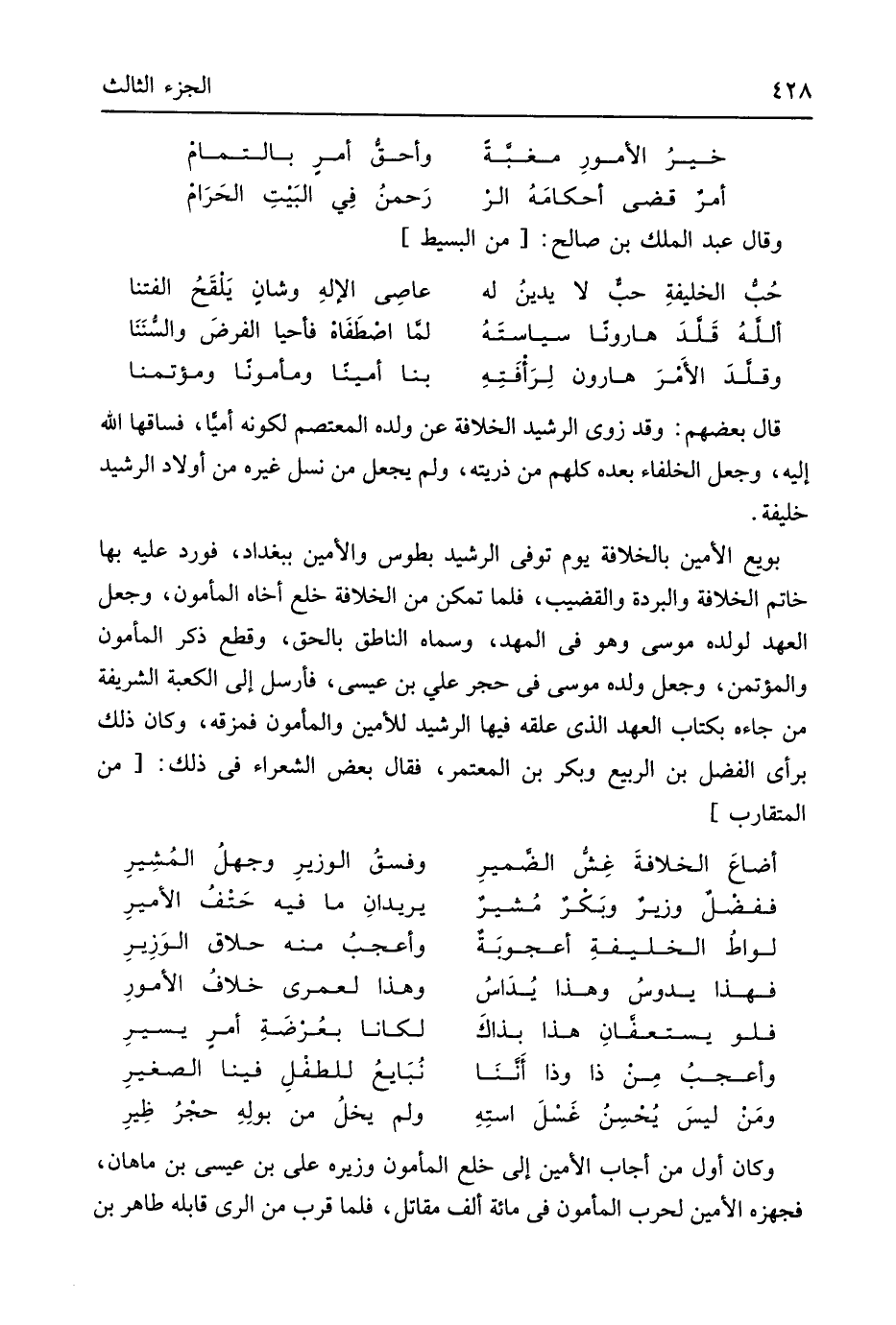قَالَ بَعضهم وَقد زوى الرشيد الْخلَافَة عَن وَلَده المعتصم لكَونه أُمِّيا فساقها الله إِلَيْهِ وَجعل الْخُلَفَاء بعده كلهم من ذُريَّته وَلم يَجْعَل من نسل غَيره من أَوْلَاد الرشيد خَليفَة بُويِعَ الْأمين بالخلافة يَوْم توفّي الرشيد بطوس والأمين بِبَغْدَاد فورد عَلَيْهِ بهَا خَاتم الْخلَافَة والبردة والقضيب فَلَمَّا تمكن من الْخلَافَة خلع أَخَاهُ الْمَأْمُون وَجعل الْعَهْد لوَلَده مُوسَى وَهُوَ فِي المهد وَسَماهُ النَّاطِق بِالْحَقِّ وَقطع ذكر الْمَأْمُون والمؤتمن وَجعل وَلَده مُوسَى فِي حجر عَليّ بن عِيسَى فَأرْسل إِلَى الْكَعْبَة الشَّرِيفَة من جَاءَهُ بِكِتَاب الْعَهْد الَّذِي علقه فِيهَا الرشيد للأمين والمأمون فمزقه وَكَانَ ذَلِك بِرَأْي الْفضل بن الرّبيع وَبكر بن الْمُعْتَمِر فَقَالَ بعض الشُّعَرَاء فِي ذَلِك من // (المتقارب) //