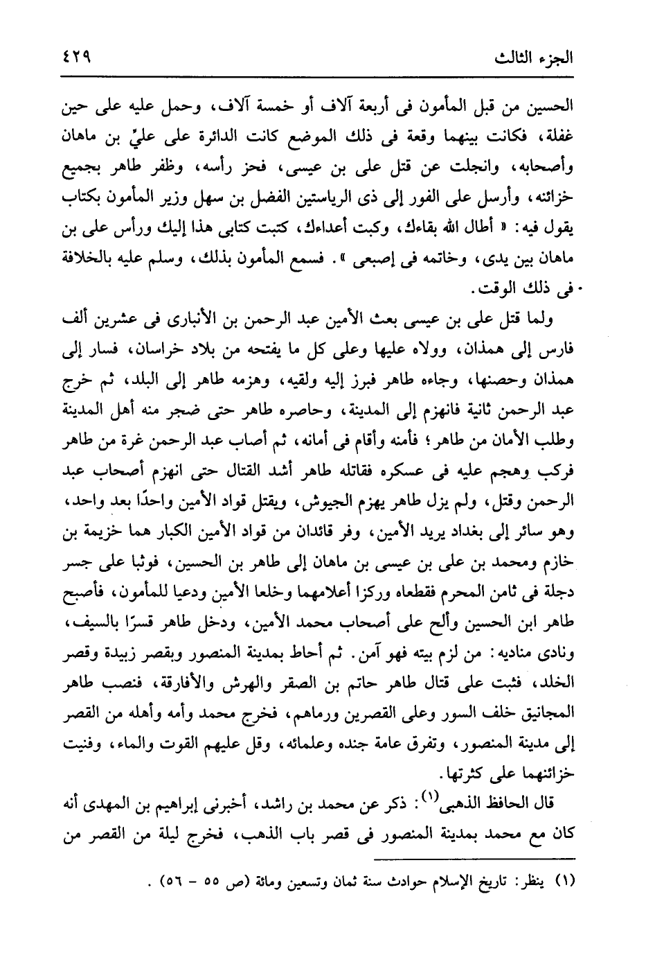 الْحُسَيْن بن قبل الْمَأْمُون فِي أَرْبَعَة آلَاف أَو خَمْسَة آلَاف وَحمل عَلَيْهِ على حِين غَفلَة فَكَانَت بَينهمَا وقْعَة فِي ذَلِك الْموضع كَانَت الدائرة على عَليّ بن ماهان وَأَصْحَابه وانجلت عَن قتل عَليّ بن عِيسَى فحز رَأسه وظفر طَاهِر بِجَمِيعِ خزائنه وَأرْسل على الْفَوْر إِلَى ذِي الرياستين الفض 1 ل بن سهل وَزِير الْمَأْمُون بِكِتَاب يَقُول فِيهِ أَطَالَ الله بَقَاءَك وكتبت أعداوءك كتبت كتابي هَذَا إِلَيْك وَرَأس عَليّ بن ماهان بَين يَدي وخاتمه فِي إصبعي فَسمع الْمَأْمُون بذلك وَسلم عَلَيْهِ بالخلافة فِي ذَلِك الْوَقْت وَلما قتل عَليّ بن عِيسَى بعث الْأمين عبد الرَّحْمَن بن الْأَنْبَارِي فِي عشْرين ألف فَارس إِلَى همذان وولاه عَلَيْهَا وعَلى كل مَا يَفْتَحهُ من بِلَاد خرسان فَسَار إِلَى همذان وحصنها وجاءه طَاهِر فبرز إِلَيْهِ ولقيه وهزمه طَاهِر إِلَى الْبَلَد ثمَّ خرج عبد الرَّحْمَن ثَانِيَة فَانْهَزَمَ إِلَى الْمَدِينَة وحاصره طَاهِر حَتَّى ضجر مِنْهُ أهل الْمَدِينَة وَطلب الْأمان من طَاهِر فَأَمنهُ وَأقَام فِي أَمَانه ثمَّ أصَاب عبد الرَّحْمَن غرَّة من طَاهِر فَركب وهجم عَلَيْهِ فِي عسكره فقاتله طَاهِر أَشد الْقِتَال حَتَّى انهزم أَصْحَاب عبد الرَّحْمَن وَقتل وَلم يزل طَاهِر يهْزم الجيوش وَيقتل قواد الْأمين وَاحِدًا بعد وَاحِد وَهُوَ سَائِر إِلَى بَغْدَاد يُرِيد الْأمين وفر قائدا من قواد الْأمين الْكِبَار هما خُزَيْمَة بن خازم وَمُحَمّد بن عَليّ بن عِيسَى بن ماهان إِلَى طَاهِر بن الْحُسَيْن فوثبا على جسر دجلة فِي ثامن الْمحرم فقطعاه وركزا أعلامهما وخلعا الْأمين ودعيا لِلْمَأْمُونِ فَأصْبح طَاهِر ابْن الْحُسَيْن وألح على أَصْحَاب مُحَمَّد الْأمين وَدخل طَاهِر قسرَاً بِالسَّيْفِ ونادى مناديه من لزم بَيته فَهُوَ آمن ثمَّ أحَاط بِمَدِينَة الْمَنْصُور وبقصر زبيدة وَقصر الْخلد فَثَبت على قتال طَاهِر حَاتِم بن الصَّقْر والهرش والأفارقة فنصب طَاهِر المجانيق خلف السُّور وعَلى القصرين وَرَمَاهُمْ فَخرج مُحَمَّد وَأمه وَأَهله من الْقصر إِلَى مَدِينَة الْمَنْصُور وتفرق عَامَّة جنده وعلمائه وَقل عَلَيْهِم الْقُوت وَالْمَاء وفنيت خزائنهما على كثرتها قَالَ الْحَافِظ الذَّهَبِيّ ذكر عَن مُحَمَّد بن رَاشد أَخْبرنِي إِبْرَاهِيم بن الْمهْدي أَنه كَانَ مَعَ مُحَمَّد بِمَدِينَة الْمَنْصُور فِي قصر بَاب الذَّهَب فَخرج لَيْلَة من الْقصر من