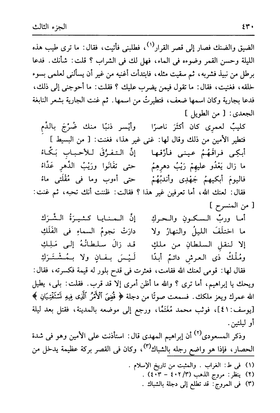 الضّيق والضنك فَصَارَ إِلَى قصر الْقَرار فطلبني فَأتيت فَقَالَ مَا ترى طيب هَذِه اللَّيْلَة وَحسن الْقَمَر وضوءه فِي المَاء فَهَل لَك فِي الشَّرَاب قلت شَأْنك فَدَعَا برطل من نَبِيذ فشربه ثمَّ سقيت مثله فابتدأت أغنيه من غير أَن يسألني لعلمي بِسوء خلقه فغنيت فَقَالَ مَا تَقول فِيمَن يضْرب عَلَيْك فَقلت مَا أحوجني إِلَى ذَلِك فَدَعَا بِجَارِيَة وَكَانَ اسْمهَا ضعف فتطيرتُ من اسْمهَا ثمَّ غنت الْجَارِيَة بِشعر النَّابِغَة الْجَعْدِي // (من الطَّوِيل) //