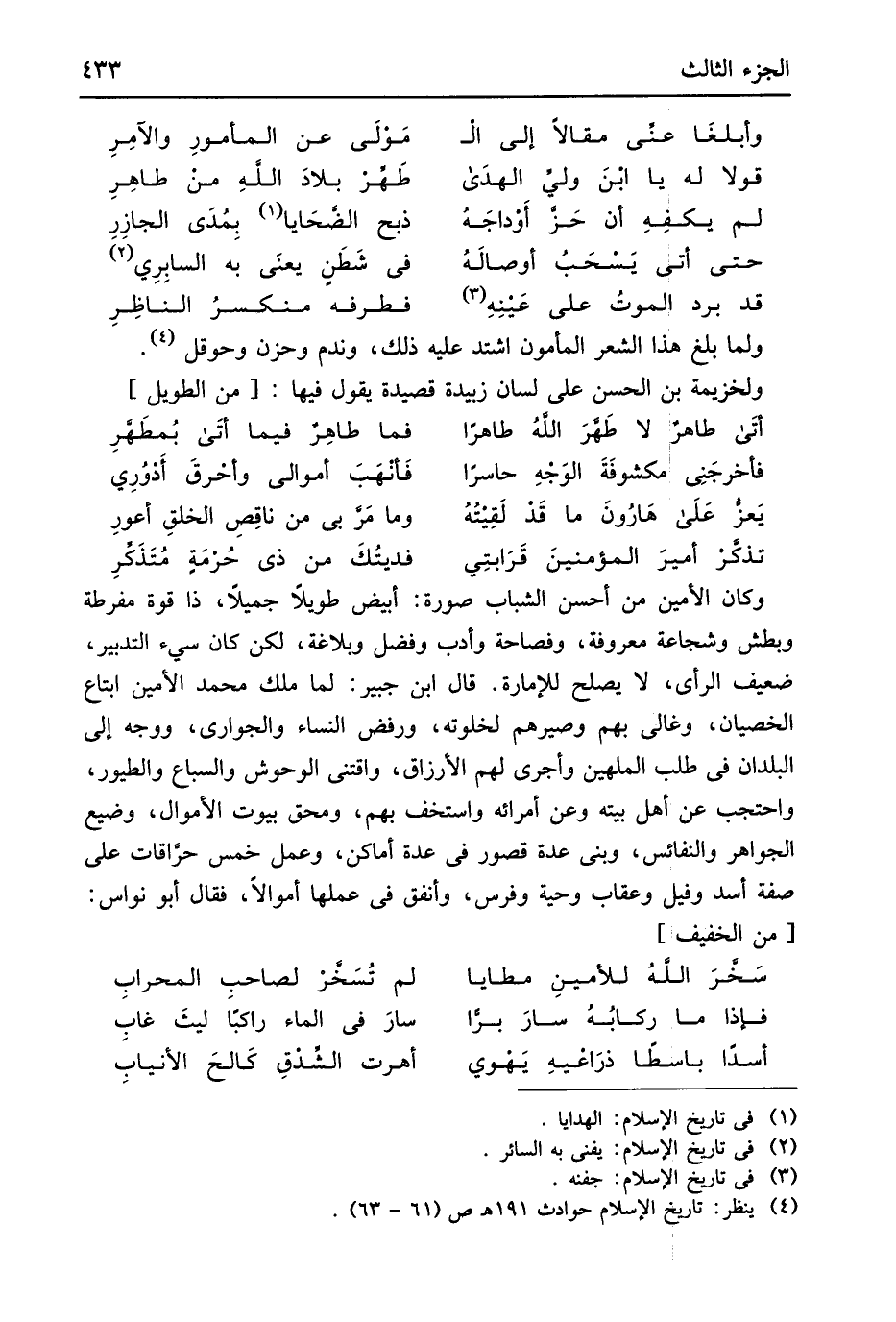 وَلما بلغ هَذَا الشّعْر الْمَأْمُون اشْتَدَّ عَلَيْهِ ذَلِك وَنَدم وحزن وحوقل ولخزيمة بن الْحسن على لِسَان زبيدة قصيدة يَقُول فِيهَا من // (الطَّوِيل) //