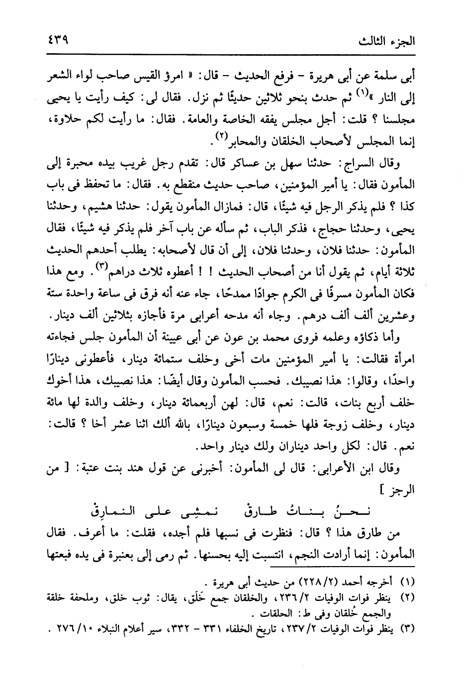 أبي سَلمَة عَن أبي هُرَيْرَة فَرفع الحَدِيث قَالَ امْرُؤ الْقَيْس صَاحب لِوَاء الشّعْر إِلَى النَّار ثمَّ حدث بِنَحْوِ ثَلَاثِينَ حديثَاً ثمَّ نزل فَقَالَ لي كَيفَ رَأَيْت يَا يحيى مَجْلِسنَا قلت أجل مجْلِس يفقه الْخَاصَّة والعامة فَقَالَ مَا رَأَيْت لكم حلاوة إِنَّمَا الْمجْلس لأْصحاب الخلقان والمحابر وَقَالَ السراج حَدثنَا سهل بن عَسَاكِر قَالَ تقدم رجل غَرِيب بِيَدِهِ محبرة إِلَى الْمَأْمُون فَقَالَ يَا أَمِير الْمُؤمنِينَ صَاحب حَدِيث مُنْقَطع بِهِ قَالَ مَا تحفظ فِي بَاب كَذَا فَلم يذكر الرجل فِيهِ شَيْئا قَالَ فمازال الْمَأْمُون يَقُول حَدثنَا هشيم وَحدثنَا يحيى وَحدثنَا حجاج فَذكر الْبَاب ثمَّ سَأَلَهُ عَن بَاب آخر فَلم يذكر فِيهِ شَيْئا فَقَالَ الْمَأْمُون حَدثنَا فلَان وَحدثنَا فلَان إِلَى أَن قَالَ لأَصْحَابه يطْلب أحدهم الحَدِيث ثَلَاثَة أَيَّام ثمَّ يَقُول أَنا من أَصْحَاب الحَدِيث أَعْطوهُ ثَلَاث دَرَاهِم وَمَعَ هَذَا فَكَانَ الْمَأْمُون مُسْرِفًا فِي الْكَرم جواداً ممدحاً جَاءَ عَنهُ أَنه فرق فِي سَاعَة وَاحِدَة سِتَّة وَعشْرين ألف ألف دِرْهَم وَجَاء أَنه مدحه أَعْرَابِي مرّة فَأَجَازَهُ بِثَلَاثِينَ ألف دِينَار وَأما ذكاؤه وَعلمه فروى مُحَمَّد بن عون عَن أبي عُيَيْنَة أَن الْمَأْمُون جلس فَجَاءَتْهُ امْرَأَة فَقَالَت يَا أَمِير الْمُؤمنِينَ مَاتَ أخي وَخلف سِتّمائَة دِينَار فأعطوني دِينَارا وَاحِدًا وَقَالُوا هَذَا نصيبك فَحسب الْمَأْمُون وَقَالَ أَيْضا هَذَا نصيبك هَذَا أَخُوك خلف أَربع بَنَات قَالَت نعم قَالَ لَهُنَّ أَرْبَعمِائَة دِينَار وَخلف وَالِدَة لَهَا مائَة دِينَار وَخلف زَوْجَة فلهَا خَمْسَة وَسَبْعُونَ دِينَارا بِاللَّه أَلَك اثْنَا عشر أَخا قَالَت نعم قَالَ لكل وَاحِد دِينَارَانِ وَلَك دِينَار وَاحِد وَقَالَ ابْن الْأَعرَابِي قَالَ لي الْمَأْمُون أَخْبرنِي عَن قَول هِنْد بنت عتبَة من // (الرجز) //