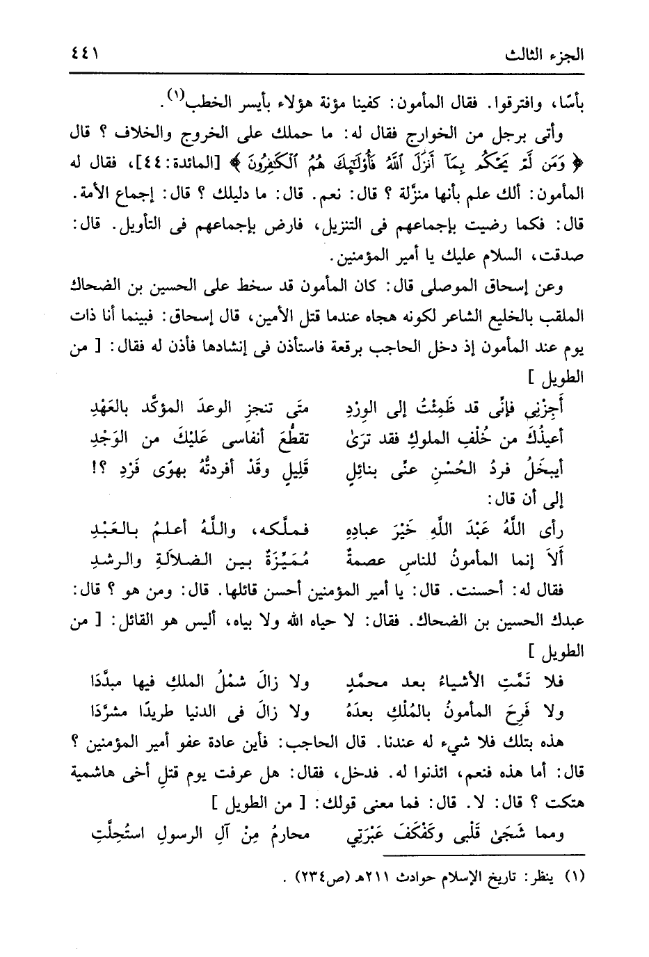بأسَاً وافترقوا فَقَالَ الْمَأْمُون كفينا مُؤنَة هَؤُلَاءِ بأيسر الْخطب وأتى بِرَجُل من الْخَوَارِج فَقَالَ لَهُ مَا حملك على الْخُرُوج وَالْخلاف قَالَ {وَمَن لم يحكمُ بِمَا أَنزَلَ اَللهّ فَأُولَئكَ هُمُ الْكَافِرُونَ} الْمَائِدَة 44 فَقَالَ لَهُ الْمَأْمُون أَلَك علم بِأَنَّهَا منزَّلة قَالَ نعم قَالَ مَا دليلك قَالَ إِجْمَاع الْأمة قَالَ فَكَمَا رضيت بإجماعهم فِي التَّنْزِيل فارض بإجماعهم فِي التَّأْوِيل قَالَ صدقت السَّلَام عَلَيْك يَا أَمِير الْمُؤمنِينَ وَعَن إِسْحَاق الْموصِلِي قَالَ كَانَ الْمَأْمُون قد سخط على الْحُسَيْن بن الضَّحَّاك الملقب بالخليع الشَّاعِر لكَونه هجاه عِنْدَمَا قتل الْأمين قَالَ إِسْحَاق فَبَيْنَمَا أَنا ذَات يَوْم عِنْد الْمَأْمُون إِذْ دخل الْحَاجِب برقعة فَاسْتَأْذن فِي إنشادها فَأذن لَهُ فَقَالَ // (من الطَّوِيل) //