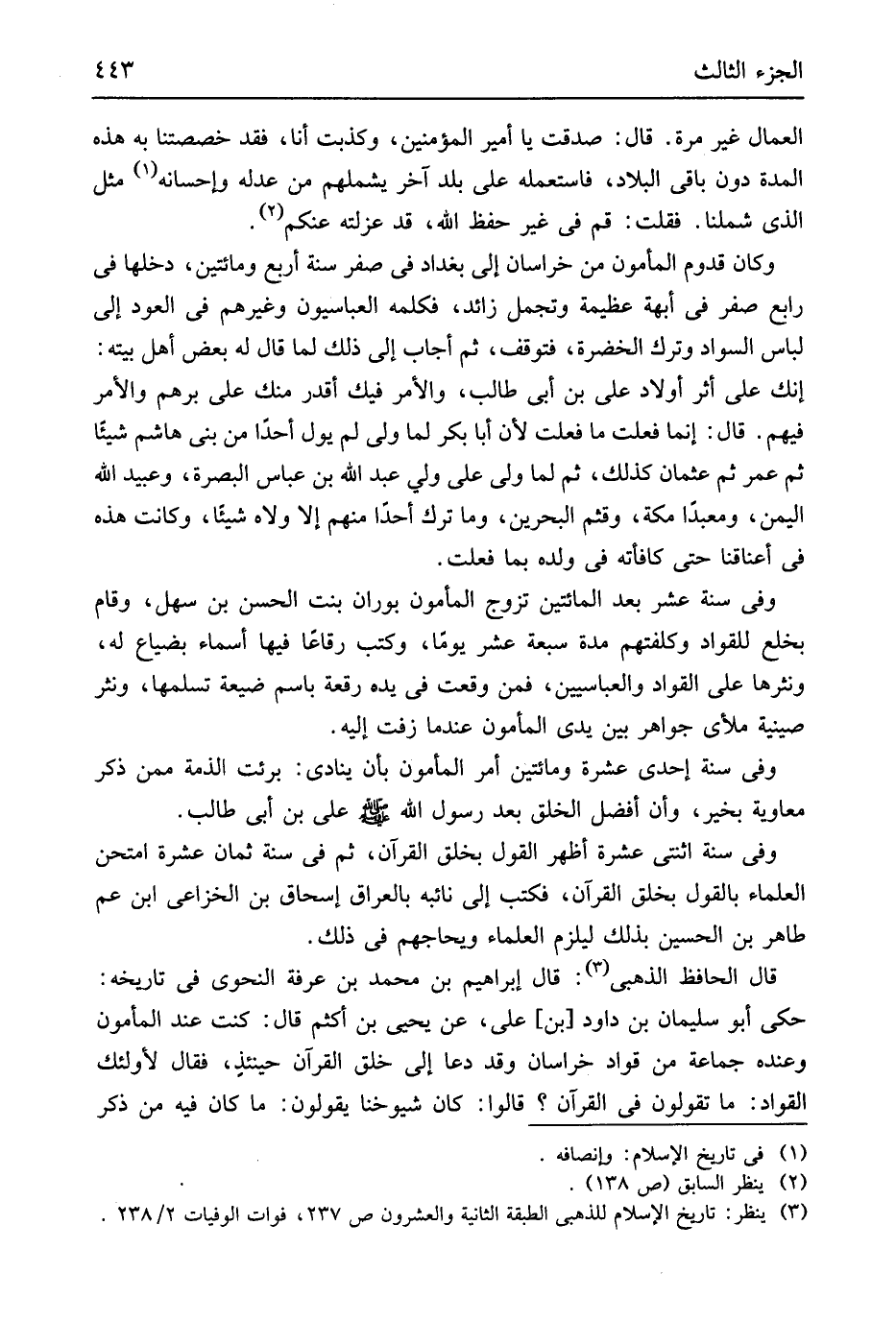 عَليّ بن أبي طَالب وَفِي سنة اثْنَتَيْ عشرَة أظهر القَوْل بِخلق الْقُرْآن ثمَّ فِي سنة ثَمَان عشرَة امتحن الْعلمَاء بالْقَوْل بِخلق الْقُرْآن فَكتب إِلَى نَائِبه بالعراق إِسْحَاق بن الْخُزَاعِيّ ابْن عَم طَاهِر بن الْحُسَيْن بذلك ليلزم الْعلمَاء ويحاجهم فِي ذَلِك قَالَ الْحَافِظ الذَّهَبِيّ قَالَ إِبْرَاهِيم بن مُحَمَّد بن عَرَفَة النَّحْوِيّ فِي تَارِيخه حكى أَبُو سُلَيْمَان بن دَاوُد بن عَليّ عَن يحيى بن أَكْثَم قَالَ كنت عِنْد الْمَأْمُون وَعِنْده جمَاعَة من قواد خُرَاسَان وَقد دَعَا إِلَى خلق الْقُرْآن حينئذِ فَقَالَ لأولئك القواد مَا تَقولُونَ فِي الْقُرْآن قَالُوا كَانَ شُيُوخنَا يَقُولُونَ مَا كَانَ فِيهِ ذكر