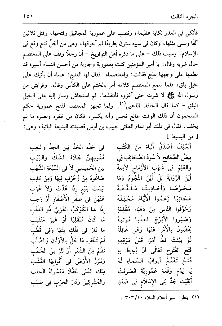 لَا شربته حَتَّى أغزوه فأنتقذها ثمَّ استجاش وَسَار إِلَيْهِ على الْخَيل البلق كَمَا قَالَ الْحَافِظ الذَّهَبِيّ وَلما تجهز المعتصم لفتح عمورية حكم المنجون أَن ذَلِك الْوَقْت طالع نحس وَأَنه يكسر فَكَانَ من ظفره وَنَصره مَا لم يخف فَقَالَ فِي ذَلِك أَبُو تَمام الطَّائِي حبيب بن أَوْس قصيدته البديعة البائية وَهِي من // (الْبَسِيط) //