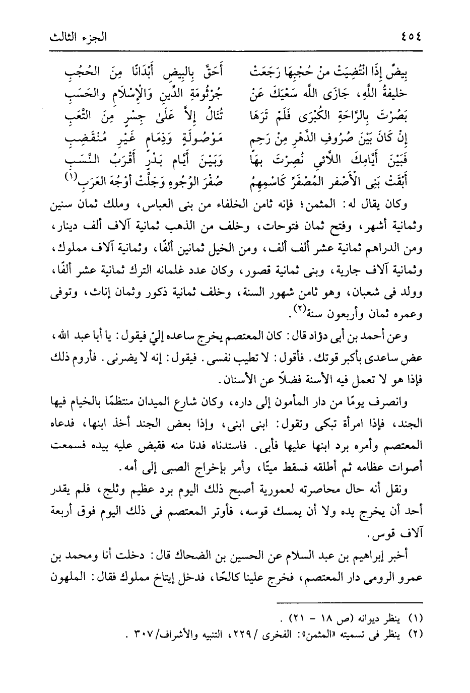 وَكَانَ يُقَال لَهُ الْمُثمن فَإِنَّهُ ثامن الْخُلَفَاء من بني الْعَبَّاس وَملك ثَمَان سِنِين وَثَمَانِية أشهر وَفتح ثَمَان فتوحات وَخلف من الذَّهَب ثَمَانِيَة آلَاف ألف دِينَار وَمن الدَّرَاهِم ثَمَانِيَة عشر ألف ألف وَمن الْخَيل ثَمَانِينَ ألفا وَثَمَانِية آلَاف مَمْلُوك وَثَمَانِية آلَاف جَارِيَة وَبنى ثَمَانِيَة قُصُور وَكَانَ عدد غلمانه التّرْك ثَمَانِيَة عشر ألفا وَولد فِي شعْبَان وَهُوَ ثامن شهور السّنة وَخلف ثَمَانِيَة ذُكُور وثمان إناث وَتُوفِّي وعمره ثَمَان وَأَرْبَعُونَ سنة وَعَن أَحْمد بن بِي دؤاد قل كَانَ المعتصم يخرج ساعده إليّ فَيَقُول يَا أَبَا عبد الله عض ساعدي بأكبر قوتك فَأَقُول لَا تطيب نَفسِي فَيَقُول إِنَّه لَا يضرني فأروم ذَلِك فَإِذا هُوَ لَا تعْمل فِيهِ الأسنة فضلا عَن الْأَسْنَان وَانْصَرف يَوْمًا من دَار الْمَأْمُون إِلَى دَاره وَكَانَ شَارِع لميدان منتظماً بالخيام فِيهَا الْجند فَإِذا امْرَأَة تبْكي وَتقول ابْني ابْني وَإِذا بعض الْجند أَخذ ابْنهَا فَدَعَاهُ المعتصم وَأمره برد ابْنهَا عَلَيْهَا فَأبى فاستدناه فَدَنَا مِنْهُ فَقبض الْجند عَلَيْهِ بِيَدِهِ فَسمِعت أصوات عِظَامه ثمَّ أطلقهُ فَسقط مَيتا وَأمر بِإِخْرَاج الصَّبِي إِلَى أمه وَنقل أَنه حَال محاصرته لعمورية أصبح ذَلِك الْيَوْم برد عَظِيم وثلج فَلم يقدر أحد أَن يخرج يَده وَلَا أَن يمسك قوسه فأوتر المعتصم فِي ذَلِك الْيَوْم فَوق أَرْبَعَة آلَاف قَوس أخبر إِبْرَاهِيم بن عبد السَّلَام عَن الْحُسَيْن بن الضَّحَّاك قَالَ دخلت أَنا وَمُحَمّد بن عَمْرو الرُّومِي دَار المعتصم فَخرج علينا كالحا فَدخل إيتاخ مَمْلُوك فَقَالَ الملهون