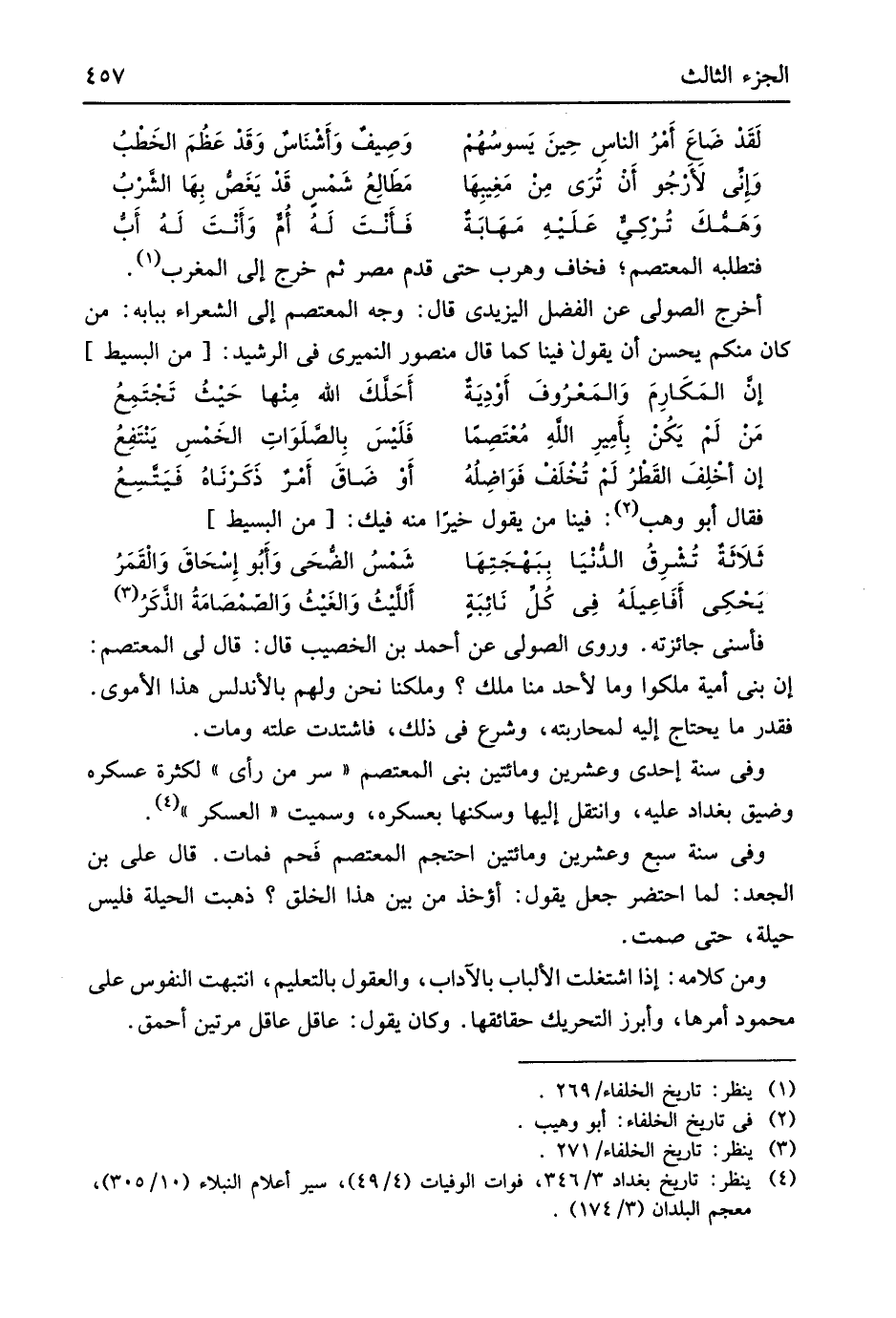 فتطلبه المعتصم فخاف وهرب حَتَّى قدم مصر ثمَّ خرج إِلَى الْمغرب أخرج الصولي عَن الْفضل اليزيدي قَالَ وَجه المعتصم إِلَى الشُّعَرَاء بِبَابِهِ من كَانَ مِنْكُم يحسن أَن يَقُول فِينَا قَالَ مَنْصُور النميري فِي الرشيد // (من الْبَسِيط) //)