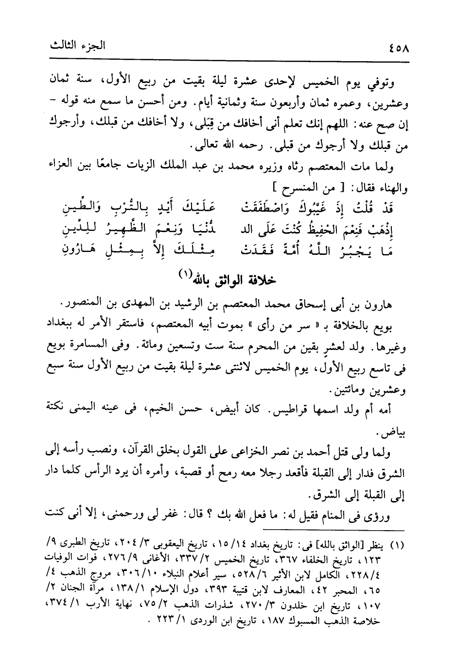هَارُون بن أبي إِسْحَاق مُحَمَّد المعتصم بن الرشيد بن الْمهْدي بن الْمَنْصُور بُويِعَ بالخلافة ب سر من رأى بِمَوْت أَبِيه المعتصم فاستقر الْأَمر لَهُ بِبَغْدَاد وَغَيرهَا ولد لعشرِ بَقينَ من الْمحرم سنة سِتّ وَتِسْعين وَمِائَة وَفِي المسامرة بُويِعَ فِي تَاسِع ربيع الأول يَوْم الْخَمِيس لِاثْنَتَيْ عشرَة لَيْلَة بقيت من ربيع الأول سنة سبع وَعشْرين وَمِائَتَيْنِ أمه أم ولد اسْمهَا قَرَاطِيس كَانَ أَبيض حسن الخيم فِي عينه الْيُمْنَى نُكْتَة بَيَاض وَلم ولي قتل أَحْمد بن نصر الْخُزَاعِيّ على القَوْل بِخلق الْقُرْآن وَنصب رَأسه الشرق فدار إِلَى الْقبْلَة فَأقْعدَ رجلا مَعَه رمح أَو قَصَبَة وَأمره أَن يرد الرَّأْس كلما دَار إِلَى الْقبْلَة إِلَى الشرق ورؤى فِي الْمَنَام فَقيل لَهُ مَا فعل الله بك قَالَ غفر لي ورحمني إِلَّا أَنِّي كنت