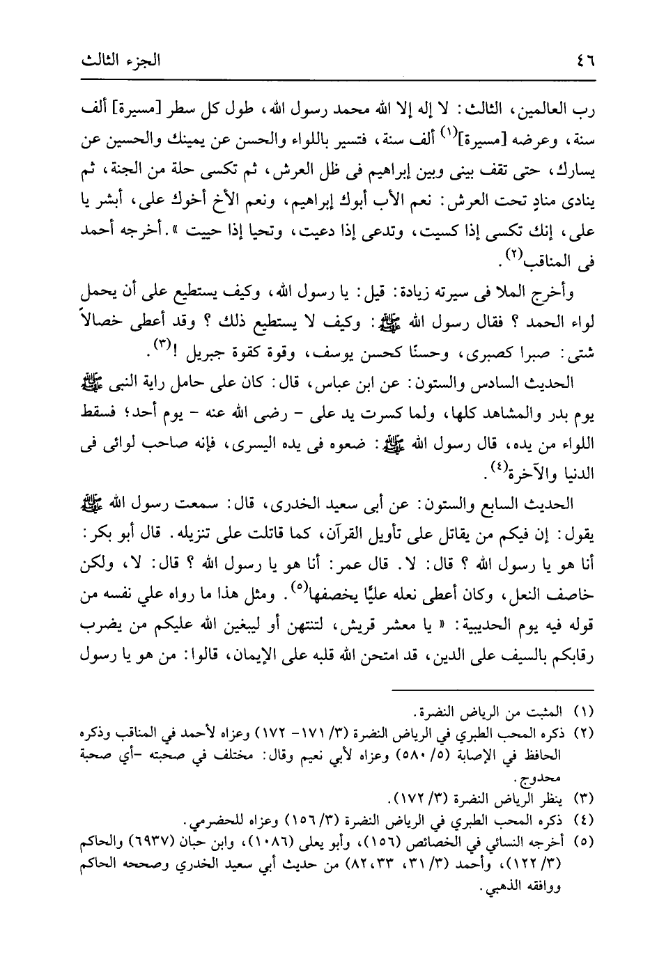 رب الْعَالمين الثَّالِث لَا إِلَه إِلَّا الله مُحَمَّد رَسُول الله طول كل سطر مسيرَة ألف سنة وَعرضه مسيرَة ألف سنة فتسير باللواء وَالْحسن عَن يَمِينك وَالْحُسَيْن عَن يسارك حَتَّى تقف بيني وَبَين إِبْرَاهِيم فِي ظلّ الْعَرْش ثمَّ تُكْسَى حلَّة من الْجنَّة ثمَّ يُنَادي مُنَادِي تَحت الْعَرْش نعم الْأَب أَبوك إِبْرَاهِيم وَنعم الْأَخ أَخُوك عَليّ أبشر يَا عَليّ إِنَّك تُكْسَى إِذا كُسِيت وتدعى إِذا دعيت وتحيا إِذا حييت أخرجه أَحْمد فِي المناقب وَأخرج الملا فِي سيرته زِيَادَة قيل يَا رَسُول الله وَكَيف يَسْتَطِيع على أَن يحمل لِوَاء الْحَمد فَقَالَ رَسُول الله