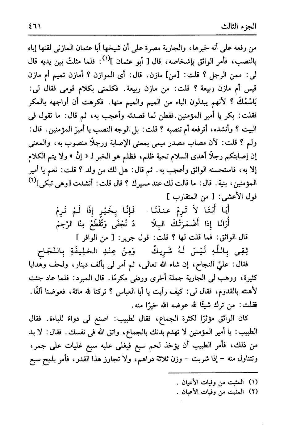 من رَفعه على أَنه خَبَرهَا وَالْجَارِيَة مصرة على لِأَن شيخها أَبَا عُثْمَان الْمَازِني لقنها إِيَّاه بِالنّصب فَأمر الواثق بإشخاصه قَالَ أَبُو عُثْمَان فَلَمَّا مثلتُ بَين يَدَيْهِ قَالَ لي مِمَّن الرجل قلت من مَازِن قَالَ أَي الموازن أمازن تَمِيم أم مَازِن قيس أم مَازِن ربيعَة قلت من مَازِن ربيعَة فكلمني بِكَلَام قومِي فَقَالَ لي بَاسمُكَ لأَنهم يبدلون الْبَاء من الْمِيم وَالْمِيم مِنْهَا فَكرِهت أَن أواجهه بالمكر فَقلت بكر يَا أَمِير الْمُؤمنِينَ فَفطن لما قصدته وأعجب بِهِ ثمَّ قَالَ مَا تَقول فِي الْبَيْت وأنشده أترفعه أم تنصبه قلت بل الْوَجْه النصب يَا أميرَ الْمُؤمنِينَ قَالَ وَلم قلت لِأَن مصاب مصدر ميمي بِمَعْنى الْإِصَابَة ورجلا مَنْصُوب بِهِ وَالْمعْنَى إِن إصابتكم رجلا أهْدى السَّلَام تَحِيَّة ظلم فظلم هُوَ الْخَبَر ل إِن وَلَا يتم الْكَلَام إِلَّا بِهِ فَاسْتَحْسَنَهُ الواثق وأعجب بِهِ ثمَّ قَالَ هَل لَك من ولد قلت نعم يَا أَمِير الْمُؤمنِينَ بنية قَالَ مَا قَالَت لَك عِنْد مسيرك قَالَ قلت أنشدت وَهِي تبْكي قَول الْأَعْشَى // (من المتقارب) //