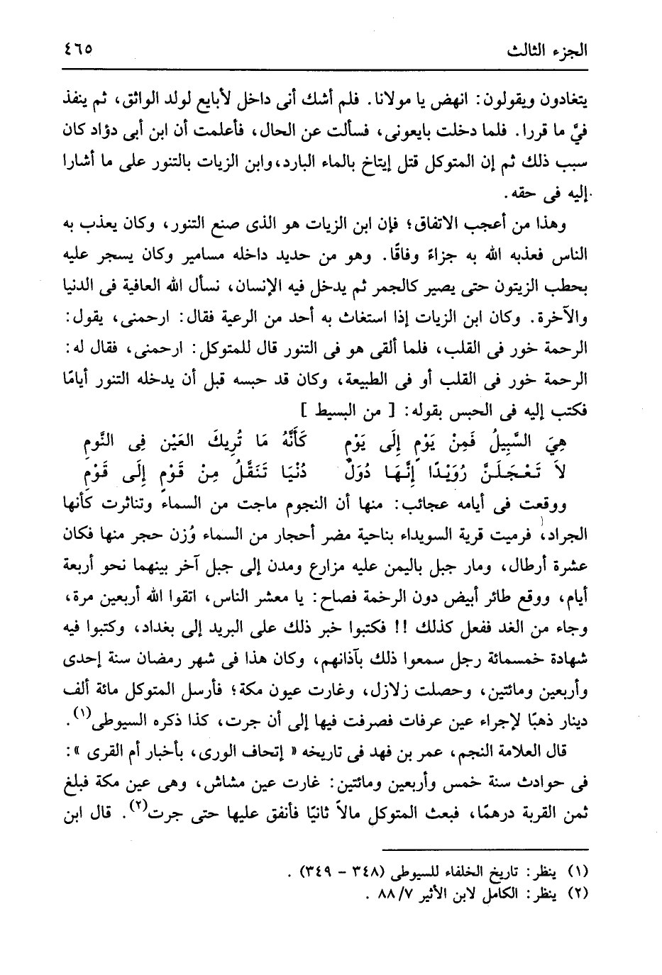 يتغادون وَيَقُولُونَ انهض يَا مَوْلَانَا فَلم أَشك أَنِّي دَاخل لأبايع لولد الواثق ثمَّ ينفذ فِي مَا قررا فَلَمَّا دخلت بايعوني فَسَأَلت عَن الْحَال فأعلمت أَن ابْن أبي دؤاد كَانَ سَبَب ذَلِك ثمَّ إِن المتَوَكل قتل إيتاخ بِالْمَاءِ الْبَارِد وَابْن الزيات بالتنور على مَا أَشَارَ إِلَيّ فِي حَقه وَهَذَا من أعجب الِاتِّفَاق فَإِن ابْن الزيات هُوَ الَّذِي صنع التَّنور وَكَانَ يعذب بِهِ النَّاس فَعَذَّبَهُ الله بِهِ جَزَاء وفَاقا وَهُوَ من حَدِيد دَاخله مسامير وَكَانَ يسجر عَلَيْهِ بحطب الزَّيْتُون حَتَّى يصير كالجمر ثمَّ يدْخل فِيهِ الْإِنْسَان نسْأَل الله الْعَافِيَة فِي الدُّنْيَا وَالْآخِرَة وَكَانَ ابْن الزيات إِذا اسْتَغَاثَ بِهِ أحد من الرّعية فَقَالَ ارْحَمْنِي يَقُول الرَّحْمَة خور فِي الْقلب فَلَمَّا ألْقى هُوَ فِي التَّنور قَالَ للمتوكل ارْحَمْنِي فَقَالَ لَهُ الرَّحْمَة خور فِي الْقلب أَو فِي الطبيعة وَكَانَ قد حَبسه قبل أَن يدْخلهُ التَّنور أَيَّامًا فَكتب إِلَيْهِ فِي الْحَبْس بقوله من // (الْبَسِيط) //