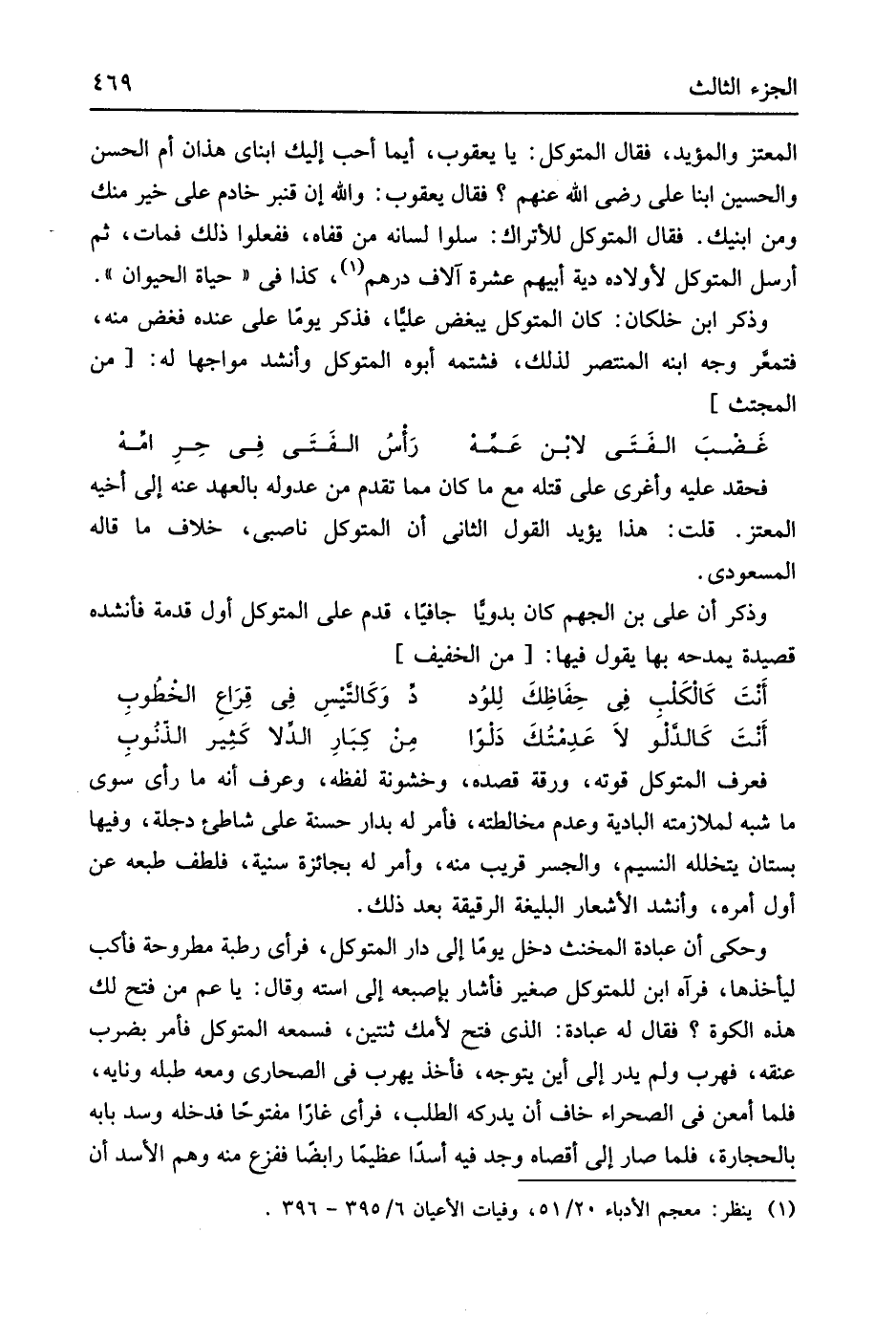 فحقد عَلَيْهِ وأغرى على قَتله مَعَ مَا كَانَ مِمَّا تقدم من عَدو لَهُ بالعهد عَنهُ إِلَى أَخِيه المعتز قلت هَذَا يُؤَيّد القَوْل الثَّانِي أَن المتَوَكل ناصبي خلاف مَا قَالَه المَسْعُودِيّ وَذكر أَن عَليّ بن الجهم كَانَ بدوياً جَافيا قدم على المتَوَكل أول قدمة فأنشده قصيدة يمدحه بهَا يَقُول فِيهَا // (الْخَفِيف) //