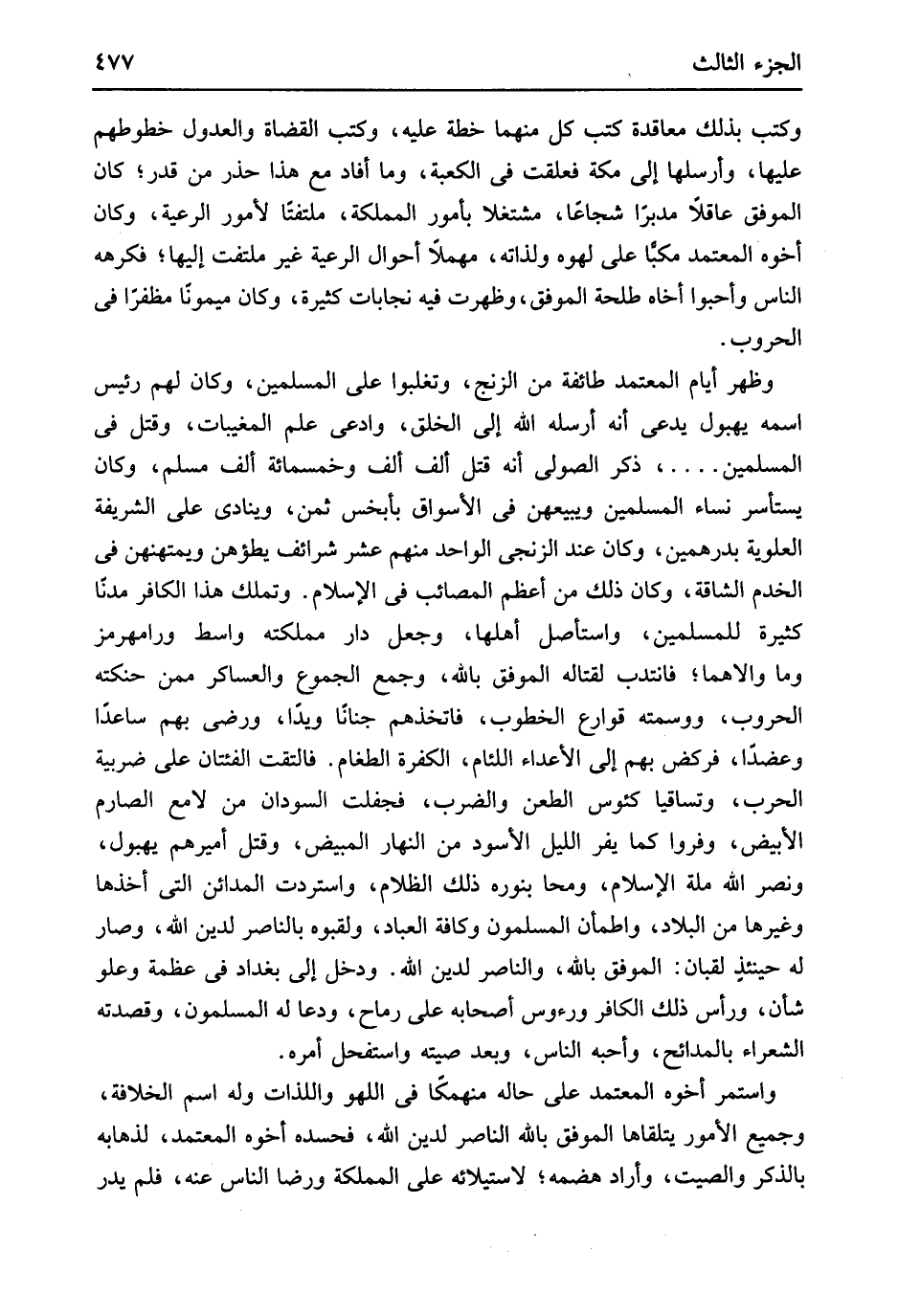 وَكتب بذلك معاقدة كتب كل مِنْهُمَا خطة عَلَيْهِ وَكتب الْقُضَاة والعدول خطوطهم عَلَيْهَا وأرسلها إِلَى مَكَّة فعلقت فِي الْكَعْبَة وَمَا أَفَادَ مَعَ هَذَا حذر من قدر كَانَ الْمُوفق عَاقِلا مُدبرا شجاعاً مشتغلا بِأُمُور المملكة ملتفتاً لأمور الرّعية وَكَانَ أَخُوهُ الْمُعْتَمد مكباً على لهوه ولذاته مهملا أَحْوَال الرّعية غير متلفت إِلَيْهَا فكرهه النَّاس وأحبوا أَخَاهُ طَلْحَة الْمُوفق وَظَهَرت فِيهِ نجابات كَثِيرَة وَكَانَ ميمونَاً مظفرا فِي الحروب وَظهر أَيَّام المعتضد طَائِفَة من الزنج وتغلبوا على الْمُسلمين وَكَانَ لَهُم رَئِيس اسْم يهبول يدعى أَنه أرْسلهُ الله إِلَى الْخلق وَادّعى علم المغيبات وَقتل فِي الْمُسلمين ذكر الصولي أَنه قتل ألف ألف وَخَمْسمِائة ألف مُسلم وَكَانَ يستأسر نسَاء الْمُسلمين ويبيعهن فِي الْأَسْوَاق بأبخس ثمن وينادي على الشَّرِيفَة العلوية بِدِرْهَمَيْنِ وَكَانَ عِنْد الزنْجِي الْوَاحِد مِنْهُم عشر شرائف يطؤهن ويمتهنهن فِي الخدم الشاقة وَكَانَ ذَلِك من أعظم المصائب فِي الْإِسْلَام وتملك هَذَا الْكَافِر مدناً كَثِيرَة للْمُسلمين واستأصل أَهلهَا وَجعل دَار مَمْلَكَته وَاسِط ورامهرمز وَمَا والاهما فَانْتدبَ لقتاله الْمُوفق بِاللَّه وَجمع الجموع والعساكر مِمَّن حنكته الحروب ووسمته قوارع الخطوب فاتخذهم جنَانًا ويداً وَرَضي بهم ساعداً وعضداً فركض بهم إِلَى الْأَعْدَاء اللئام الْكَفَرَة الطغام فالتقت الفئتان على ضريبة الْحَرْب وتساقيا كئوس الطعْن وَالضَّرْب فجفلت السودَان من لامع الصارم الْأَبْيَض وفروا كَمَا يفر اللَّيْل الْأسود من النَّهَار المبيض وَقتل أَمِيرهمْ يهبول وَنصر الله مِلَّة الْإِسْلَام ومحا بنوره ذَلِك الظلام واستردت الْمَدَائِن الَّتِي أَخذهَا وَغَيرهَا من الْبِلَاد وَاطْمَأَنَّ الْمُسلمُونَ وكافة الْعباد ولقبوه بالناصر لدين الله وَصَارَ لَهُ حينئذٍ لقبان الْمُوفق بِاللَّه والناصر لدين الله وَدخل إِلَى بَغْدَاد فِي عَظمَة وعلو شَأْن وَرَأس ذَلِك الْكَافِر ورءوس أَصْحَابه على رماح ودعا لَهُ الْمُسلمُونَ وقصدته الشُّعَرَاء بالمدائح وأحبه النَّاس وَبعد صيته واستفحل أمره وَاسْتمرّ أَخُوهُ الْمُعْتَمد على حَاله منهمكاً فِي اللَّهْو وَاللَّذَّات وَله اسْم الْخلَافَة وَجَمِيع الْأُمُور يتلقاها الْمُوفق بِاللَّه النَّاصِر لدين الله فحسده أَخُوهُ الْمُعْتَمد لذهابه بِالذكر والصيت وَأَرَادَ هضمه لاستيلائه على المملكة ورضا النَّاس عَنهُ فَلم يدر
