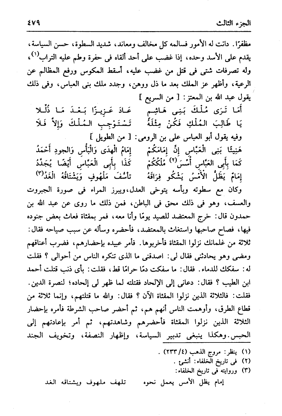 مظفراً دَانَتْ لَهُ الْأُمُور فسالمه كل مُخَالف ومعاند شَدِيد السطوة حسن السياسة يقدم على الْأسد وَحده إِذا غضب على أحد أَلْقَاهُ فِي حُفْرَة وطم عَلَيْهِ التُّرَاب وَله تَصَرُّفَات شَتَّى فِي قتل من غضب عَلَيْهِ أسقط المكوس وَرفع الْمَظَالِم عَن الرّعية وَأظْهر عز الْملك بعد مَا ذل ووهت وجدد ملك بني الْعَبَّاس وَفِي ذَلِك يَقُول عبد الله بن المعتز من // (السَّرِيع) //
