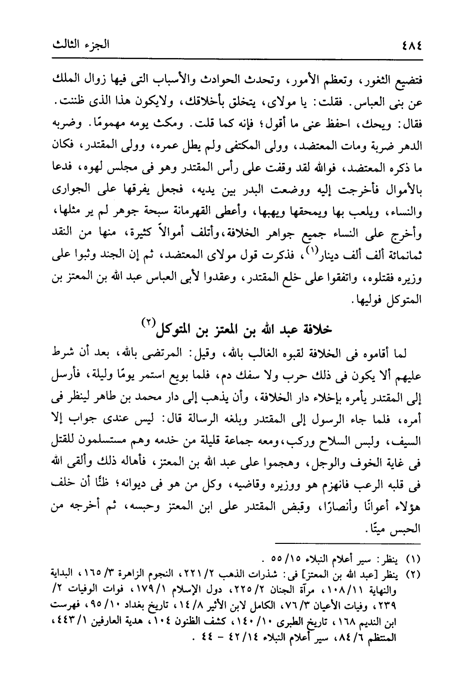 فتضيع الثغور وتعظم الْأُمُور وتحدث الْحَوَادِث والأسباب الَّتِي فِيهَا زَوَال الْملك عَن بني الْعَبَّاس فَقلت يَا مولَايَ يتخلق بأخلاقك وَلَا يكون هَذَا الَّذِي ظَنَنْت فَقَالَ وَيحك احفظ عني مَا أَقُول فَإِنَّهُ كَمَا قلت وَمكث يَوْمه مهموماً وضربه الدَّهْر ضَرْبَة وَمَات المعتضد وَولى المكتفي وَلم يطلّ عمره وَولي المقتدر فَكَانَ مَا ذكره المعتضد فوَاللَّه لقد وقفت على رَأس المقتدر وَهُوَ فِي مجْلِس لهوه فَدَعَا بالأموال فأخرجت إِلَيْهِ وَوضعت الْبَدْر بَين يَدَيْهِ فَجعل يفرقها على الْجَوَارِي وَالنِّسَاء ويلعب بهَا ويمحقها ويهبها وَأعْطى القهرمانة سبْحَة جَوْهَر لم ير مثلهَا وَأخرج على النِّسَاء جَمِيع جَوَاهِر الْخلَافَة وأتلف أَمْوَالًا كَثِيرَة مِنْهَا من النَّقْد ثَمَانمِائَة ألف ألف دِينَار فَذكرت قَول مولَايَ المعتضد ثمَّ إِن الْجند وَثبُوا على وزيره فَقَتَلُوهُ وَاتَّفَقُوا على خلع المقتدر وعقدوا لأبي الْعَبَّاس عبد الله بن المعتز بن المتَوَكل فوليها