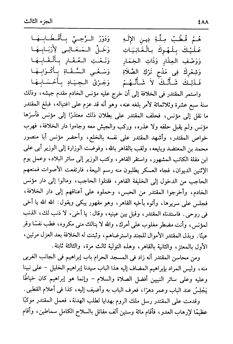 وَاسْتمرّ المقتدر فِي الْخلَافَة إِلَى أَن خرج عَلَيْهِ مؤنس الْخَادِم مقدم جَيْشه وَذَلِكَ سنة سبع عشرَة وثلاثمائة لأمر بلغه عَنهُ وَهُوَ أَنه قد عزم على اغتياله فَبلغ المقتدر مَا نقل إِلَى مؤنس فَحلف المقتدر على بطلَان ذَلِك معتذرَاً إِلَى مؤنس فأسرها مؤنس وَلم يقبل حلفه وَلَا عذره وَركب والجيش مَعَه وَجَاءُوا دَار الْخلَافَة فهرب خَواص المقتدر وَأشْهد المقتدر على نَفسه بِالْخلْعِ وأحضر مؤنس أَبَا مَنْصُور مُحَمَّد بن المعتضد وَبَايَعَهُ ولقب بالقاهر بِاللَّه وفوضت الوزارة إِلَى الْوَزير أبي عَليّ ابْن مقلة الْكَاتِب الْمَشْهُور وَاسْتقر القاهر وَكتب الْوَزير إِلَى سَائِر الْبِلَاد وَعمل يَوْم الِاثْنَيْنِ الدِّيوَان فجَاء الْعَسْكَر يطْلبُونَ مِنْهُ رسم الْبيعَة فارتفعت الْأَصْوَات فَمَنعهُمْ الْحَاجِب من الدُّخُول إِلَى الْخَلِيفَة القاهر فَقتلُوا الْحَاجِب ومالوا إِلَى دَار مؤنس الْخَادِم وأخرجوا المقتدر من الْحَبْس وَحَمَلُوهُ على أَعْنَاقهم إِلَى دَار الْخلَافَة فَجَلَسَ على سريرها وأتوه بأَخيه القاهر وَهُوَ مقهور يبكي وَيَقُول الله الله يَا أخي فِي روحي فاستدناه المقتدر وَقبل بَين عَيْنَيْهِ وَقَالَ يَا أخي لَا ذَنْب لَك الذَّنب لمؤنس وَأَنت مُضْطَر مغلوب على أَمرك وَالله لَا ينالك مني مَكْرُوه فطب نفسا وقر عينا وبذل المقتدر الْأَمْوَال للجند واسترضاه وَثبتت لَهُ الْخلَافَة بعد الْعَزْل مرَّتَيْنِ الأول بالمعتز وَالثَّانيَِة بالقاهر وَهَذِه التَّوْلِيَة ثَالِث مرّة وَالثَّالِثَة ثَابِتَة وَمن محَاسِن المقتدر أَنه زَاد فِي الْمَسْجِد الْحَرَام بَاب إِبْرَاهِيم فِي الْجَانِب الغربي مِنْهُ وَلَيْسَ المُرَاد بإبراهيم الْمُضَاف إِلَيْهِ هَذَا الْبَاب سيدنَا إِبْرَاهِيم الْخَلِيل على نَبينَا وَعَلِيهِ وعَلى سَائِر النَّبِيين أفضل الصَّلَاة وَالسَّلَام وَإِنَّمَا هُوَ إِبْرَاهِيم كَانَ خياطاً يجلِسُ عِنْد الْبَاب وَعمر دهراً فَعرف الْبَاب بِهِ وأضيف إِلَيْهِ كَذَا فِي أَعْلَام القطبي وقدمت على المقتدر رسل ملك الرّوم بِهَدَايَا لطلب الْهُدْنَة فَعمل المقتدر موكباً عَظِيما لإرهاب الْعَدو فَأَقَامَ مائَة وَسِتِّينَ ألف مقَاتل بِالسِّلَاحِ الْكَامِل سماطين وَأقَام