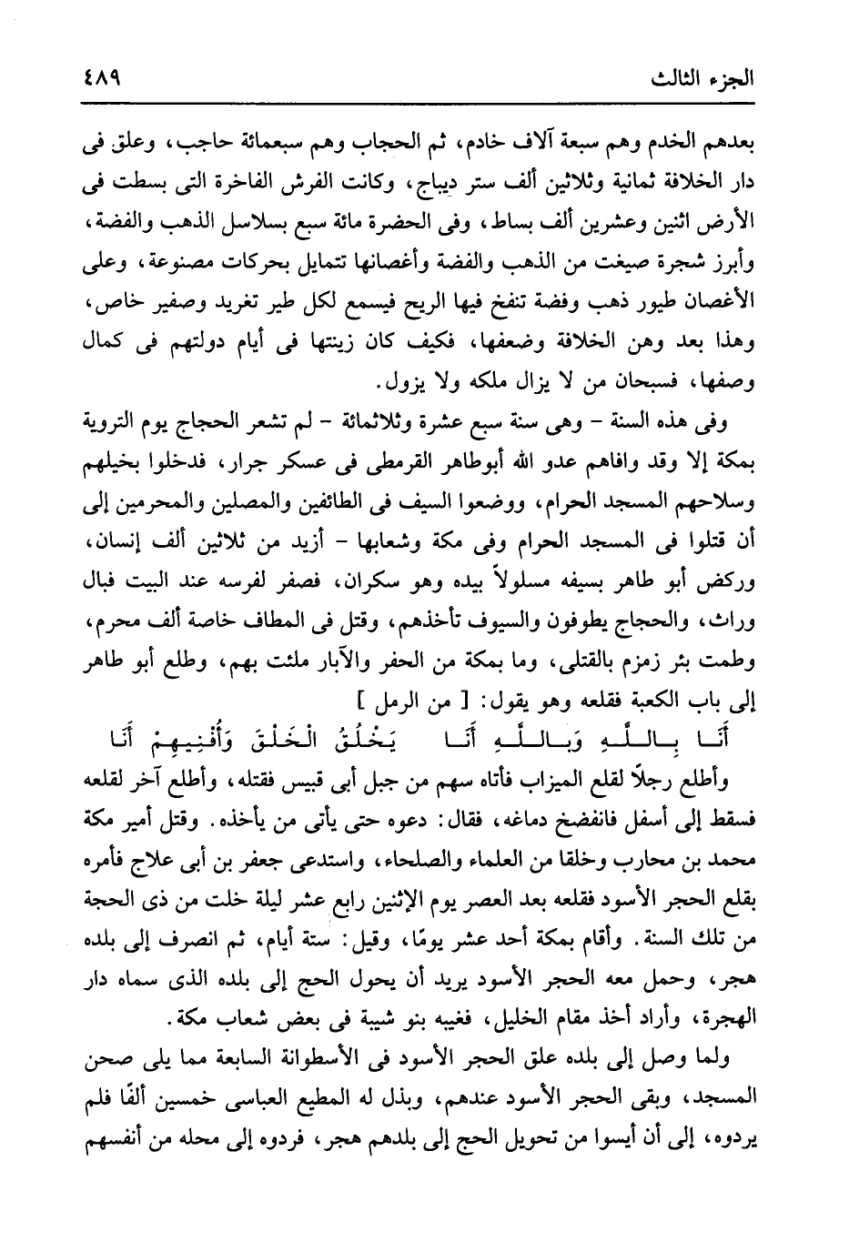 بعدهمْ الخدم وهم سَبْعَة آلَاف خَادِم ثمَّ الْحجاب وهم سَبْعمِائة حَاجِب وعلق فِي دَار الْخلَافَة ثَمَانِيَة وَثَلَاثِينَ ألف ستر ديباج وَكَانَت الْفرش الفاخرة الَّتِي بسطت فِي الأَرْض اثْنَيْنِ وَعشْرين ألف بِسَاط وَفِي الحضرة مائَة سبع بسلاسل الذَّهَب وَالْفِضَّة وأبرز شَجَرَة صيغت من الذَّهَب وَالْفِضَّة وَأَغْصَانهَا تتمايل بحركات مصنوعة وعَلى الأغصان طيور ذهب وَفِضة تنفخ فِيهَا الرّيح فَيسمع لكل طير تغريد وصفير خَاص وَهَذَا بعد وَهن الْخلَافَة وضعفها فَكيف كَانَ زينتها فِي أَيَّام دولتهم فِي كَمَال وصفهَا فسبحان من لَا يزَال ملكه وَلَا يَزُول وَفِي هَذِه السّنة وَهِي سنة سبع عشرَة وثلاثمائة لم تشعر الْحجَّاج يَوْم التَّرويَة بِمَكَّة إِلَّا وَقد وافاهم عَدو الله أَبُو طَاهِر القرمطي فِي عَسْكَر جرار فَدَخَلُوا بخيلهم وسلاحهم الْمَسْجِد الْحَرَام وَوَضَعُوا السَّيْف فِي الطائفين والمصلين والمحرمين إِلَى أَن قتلوا فِي الْمَسْجِد الْحَرَام وَفِي مَكَّة وشعابها أَزِيد من ثَلَاثِينَ ألف إِنْسَان وركض أَبُو طَاهِر بِسَيْفِهِ مسلولا بِيَدِهِ وَهُوَ سَكرَان فصفر لفرسه عِنْد الْبَيْت فَبَال وراث وَالْحجاج يطوفون وَالسُّيُوف تأخذهم وَقتل فِي المطاف خَاصَّة ألف محرم وطمت بِئْر زَمْزَم بالقتلى وَمَا بِمَكَّة من الْحفر والآبار ملئت بهم وطلع أَبُو طَاهِر إِلَى بَاب الْكَعْبَة فقلعه وَهُوَ يَقُول من // (الرمل) //