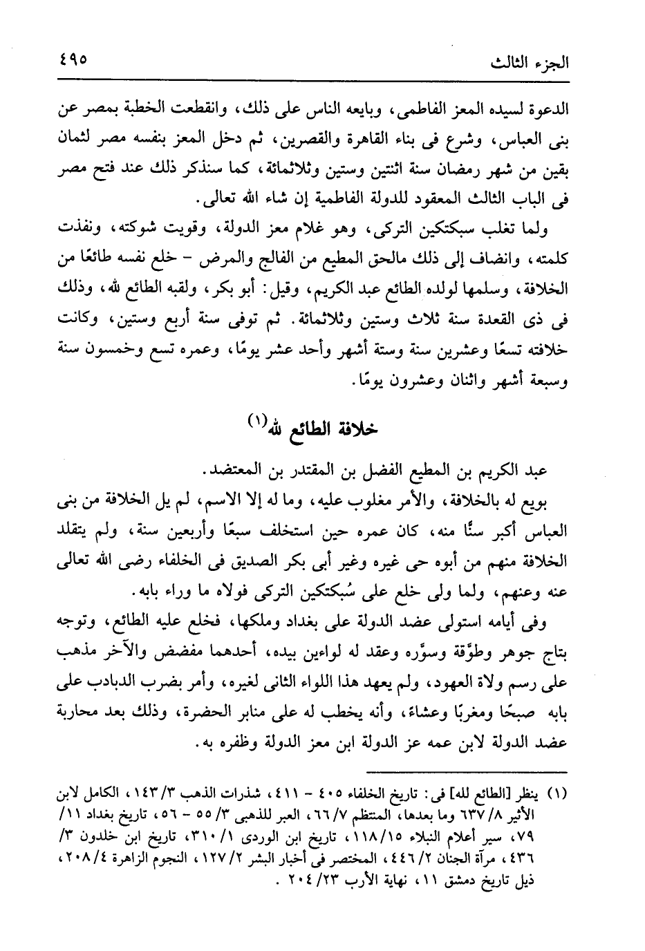 عبد الْكَرِيم بن الْمُطِيع الْفضل بن المقتدر بن المعتضد بُويِعَ لَهُ بالخلافة وَالْأَمر مغلوب عَلَيْهِ وَمَا لَهُ إِلَّا الِاسْم لم يل الْخلَافَة من بني الْعَبَّاس أكبر سنا مِنْهُ كَانَ عمره حِين اسْتخْلف سبعا وَأَرْبَعين سنة وَلم يتقلد الْخلَافَة مِنْهُم من أَبوهُ حَيّ غَيره وَغير أبي بكر الصّديق فِي الْخُلَفَاء رَضِي الله تَعَالَى عَنهُ وعنهم وَلما ولي خلع على بكتكين التركي فولاه مَا وَرَاء بَابه وَفِي أَيَّامه استولى عضد الدولة على بَغْدَاد وملكها فَخلع عَلَيْهِ الطائع وَتوجه بتاج جَوْهَر وطوقة وسوَره وَعقد لَهُ لواءين بِيَدِهِ أَحدهمَا مفضض وَالْآخر مَذْهَب على رسم وُلَاة العهود وَلم يعْهَد هَذَا اللِّوَاء الثَّانِي لغيره وَأمر بِضَرْب الدبادب على بابة صبحاً ومغرباً وعشاء وَأَنه يخْطب لَهُ على مَنَابِر الحضرة وَذَلِكَ بعد محاربة عضد الدولة لِابْنِ عَمه عز الدولة ابْن معز الدولة وظفره بِهِ