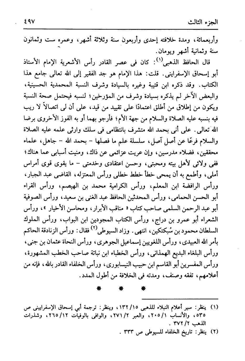 وَأَرْبَعمِائَة وَمُدَّة خِلَافَته إِحْدَى وَأَرْبَعُونَ سنة وَثَلَاثَة أشهر وعمره سِتّ وَثَمَانُونَ سنة وَثَمَانِية أشهر ويومان قَالَ الْحَافِظ الذَّهَبِيّ كَانَ فِي عصر الْقَادِر رَأس الأشعرية الإِمَام الْأُسْتَاذ أَبُو إِسْحَاق الإسفرايني قلت هَذَا الإِمَام هُوَ جد الْفَقِير إِلَى الله تَعَالَى جَامع هَذَا الْكتاب وَقد ذكره ابْن قُتَيْبَة وَغَيره بالسيادة وَشرف النِّسْبَة المحمدية الحسينية وَالْبَعْض الآخر لم يذكرهُ بسيادة وَشرف من المؤرخين لنسبه فَيحْتَمل صِحَة النِّسْبَة وَيكون من إِطْلَاق من أطلق اعْتِمَادًا على تَقْيِيد من قيد على أَن لي اتِّصَالًا لَا ريب فِيهِ بنسبه عَلَيْهِ الصَّلَاة وَالسَّلَام من جِهَة الْأُم فأرجو بهما أَو بِهِ الْفَوْز الآخروي بِرِضا الله تَعَالَى على أَنِّي بِحَمْد الله متشرف بانتظامي فِي سلك وارثي علمه عَلَيْهِ الصَّلَاة وَالسَّلَام فرعا عَن أصل آصل سلسلة علم مَا فصلها بِحَمْد الله جَاهِل عُلَمَاء محققين فضلاء مدرسين وَإِن عريت عزائمي عَن ذَاك ومنيت أسبابي عَمَّا هُنَاكَ فَفِي ولائي لأهل يته ومحبتي وَحسن اعتقادي وخدمتي مَا يُقَوي قوى أمراس أملي وأطمع بِهِ أَن يمحي خطأ خطط خطلي وَرَأس المعتزله القَاضِي عبد الْجَبَّار وَرَأس الرافضة ابْن الْمعلم وَرَأس الكرامية مُحَمَّد بن الهيصم وَرَأس الْقُرَّاء أَبُو الْحسن الحمامي وَرَأس الْمُحدثين الْحَافِظ عبد الْغَنِيّ بن سعيد وَرَأس الصُّوفِيَّة أَبُو عبد الرَّحْمَن السّلمِيّ صَاحب كتاب مَنَاقِب الْأَبْرَار ومحاسن الأخيار وَرَأس الشُّعَرَاء أَبُو عَمْرو بن دراج وَرَأس الْكتاب المجودين ابْن البواب وَرَأس الْمُلُوك السُّلْطَان مَحْمُود بن سُبكتكين انْتهى وَزَاد السُّيُوطِيّ فَقَالَ وَرَأس الزَّنَادِقَة الْحَاكِم بِأَمْر الله العبيدي وَرَأس اللغويين إِسْمَاعِيل الْجَوْهَرِي وَرَأس النُّحَاة عُثْمَان بن جني وَرَأس البلغاء البديع الهمذاني وَرَأس الخطباء ابْن نباتة صَاحب الْخطب الْمَشْهُورَة وَرَأس الْمُفَسّرين أَبُو الْقَاسِم ابْن حبيب النَّيْسَابُورِي وَرَأس الْخُلَفَاء الْقَادِر بِاللَّه فَإِنَّهُ من أعلامهم تفقه وصنف ومدته فِي الْخلَافَة من أطول المدد