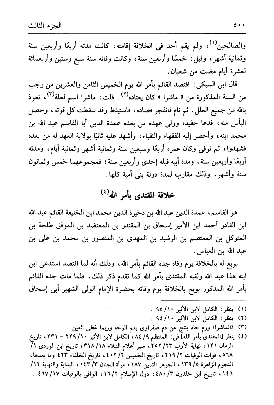وَالصَّالِحِينَ وَلم يقم أحد فِي الْخلَافَة إِقَامَته كَانَت مدَّته أربعَاً وَأَرْبَعين سنة وَثَمَانِية أشهر وَقيل خمسَاً وَأَرْبَعين سنة وَكَانَت وَفَاته سنة سبع وَسِتِّينَ وَأَرْبَعمِائَة لعشرة أَيَّام مَضَت من شعْبَان قَالَ ابْن السُّبْكِيّ افتصد الْقَائِم بِأَمْر الله يَوْم الْخَمِيس الثَّامِن وَالْعِشْرين من رَجَب من السّنة الْمَذْكُورَة من ماشرا كَانَ يعتاده قلت ماشرا اسْم لعِلَّة نَعُوذ بِاللَّه من جَمِيع الْعِلَل ثمَّ نَام فانفجر فصاده فَاسْتَيْقَظَ وَقد سَقَطت كل قوته وَحصل الْيَأْس مِنْهُ فَدَعَا حفيده وَولي عَهده من بعده عُمْدَة الدّين أَبَا الْقَاسِم عبد الله بن مُحَمَّد ابْنه وأحضر إِلَيْهِ الْفُقَهَاء والنقباء وَأشْهد عَلَيْهِ ثَانِيًا بِولَايَة الْعَهْد لَهُ من بعده فَشَهِدُوا ثمَّ توفّي وَكَانَ عمره أربعَاً وَسبعين سنة وَثَمَانِية أشر وَثَمَانِية أَيَّام ومدته أَرْبعا وَأَرْبَعين سنة وَمُدَّة أَبِيه قبله إِحْدَى وَأَرْبَعين سنة فمجموعهما خمس وَثَمَانُونَ سنة وَأشهر وَذَلِكَ مقارب لمُدَّة دولة بني أُميَّة كلهَا