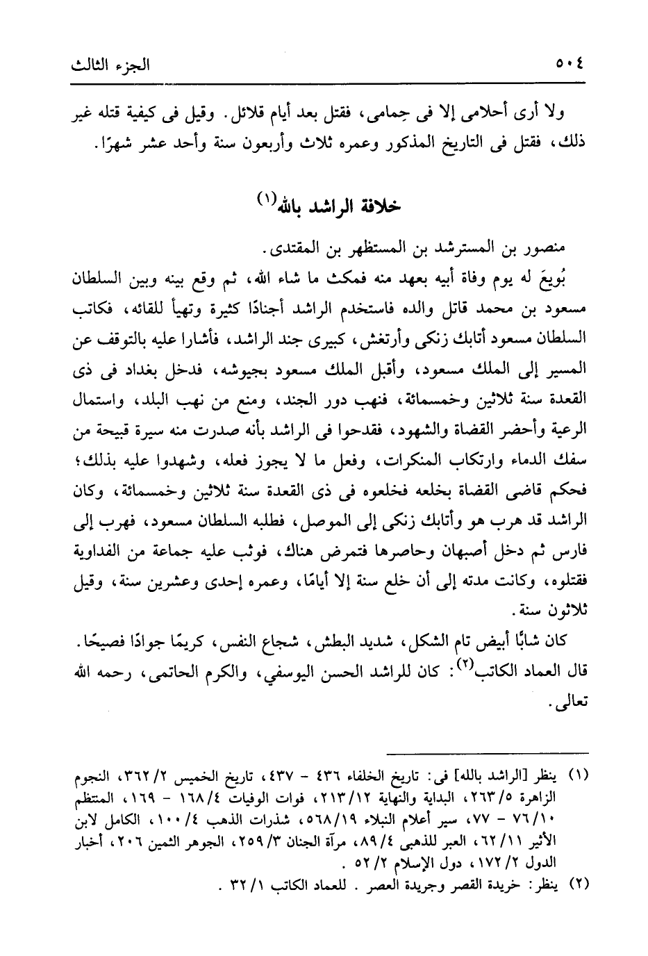 مَنْصُور بن المسترشد بن المستظهر بن الْمُقْتَدِي بُويِعَ لَهُ يَوْم وَفَاة أبيعه بِعَهْد مِنْهُ فَمَكثَ مَا شَاءَ الله ثمَّ وَقع بَينه وَبَين السُّلْطَان مَسْعُود بن مُحَمَّد قَاتل وَالِده فاستخدم الراشد أجنادا كثير وتهيأ للقائه فكاتب السُّلْطَان مَسْعُود أتابك زنكي وأرتغش كَبِير جند الراشد فَأَشَارَ إِلَيْهِ بالتوقف عَن الْمسير إِلَى الْملك مَسْعُود وَأَقْبل الْملك مَسْعُود بجيوشه فَدخل بَغْدَاد فِي ذِي الْقعدَة سنة ثَلَاثِينَ وَخَمْسمِائة فنهب دور الْجند وَمنع من نهب الْبَلَد واستمال الرّعية وأحضر الْقُضَاة وَالشُّهُود فقدحوا فِي الراشد بِأَنَّهُ صدرت مِنْهُ سيرة قبيحة من سفك الدِّمَاء وارتكاب الْمُنْكَرَات وَفعل مَا لَا يجوز فعله وشهدوا عَلَيْهِ بذلك فَحكم قَاضِي الْقُضَاة بخلعه فخلعوه فِي ذِي الْقعدَة سنة ثَلَاثِينَ وَخَمْسمِائة وَكَانَ الراشد قد هرب هُوَ وأتابك زنكي إِلَى الْموصل فَطَلَبه السُّلْطَان مَسْعُود فهرب إِلَى فَارس ثمَّ دخل أَصْبَهَان وحاصرها فتمرض هُنَاكَ فَوَثَبَ عَلَيْهِ جمَاعَة من الفداوية فَقَتَلُوهُ وَكَانَت مدَّته إِلَى أَن خلع سنة إِلَّا أَيَّامًا وعمره إِحْدَى وَعشْرين سنة وَقيل ثَلَاثُونَ سنة كَانَ شَابًّا أَبيض تَامّ الشكل شَدِيد الْبَطْش شُجَاع النَّفس كَرِيمًا جوادَاً فصيحاً قَالَ الْعِمَاد الْكَاتِب كَانَ للراشد الْحسن اليوسفي وَالْكَرم الْحَاتِمِي رَحمَه الله تَعَالَى
