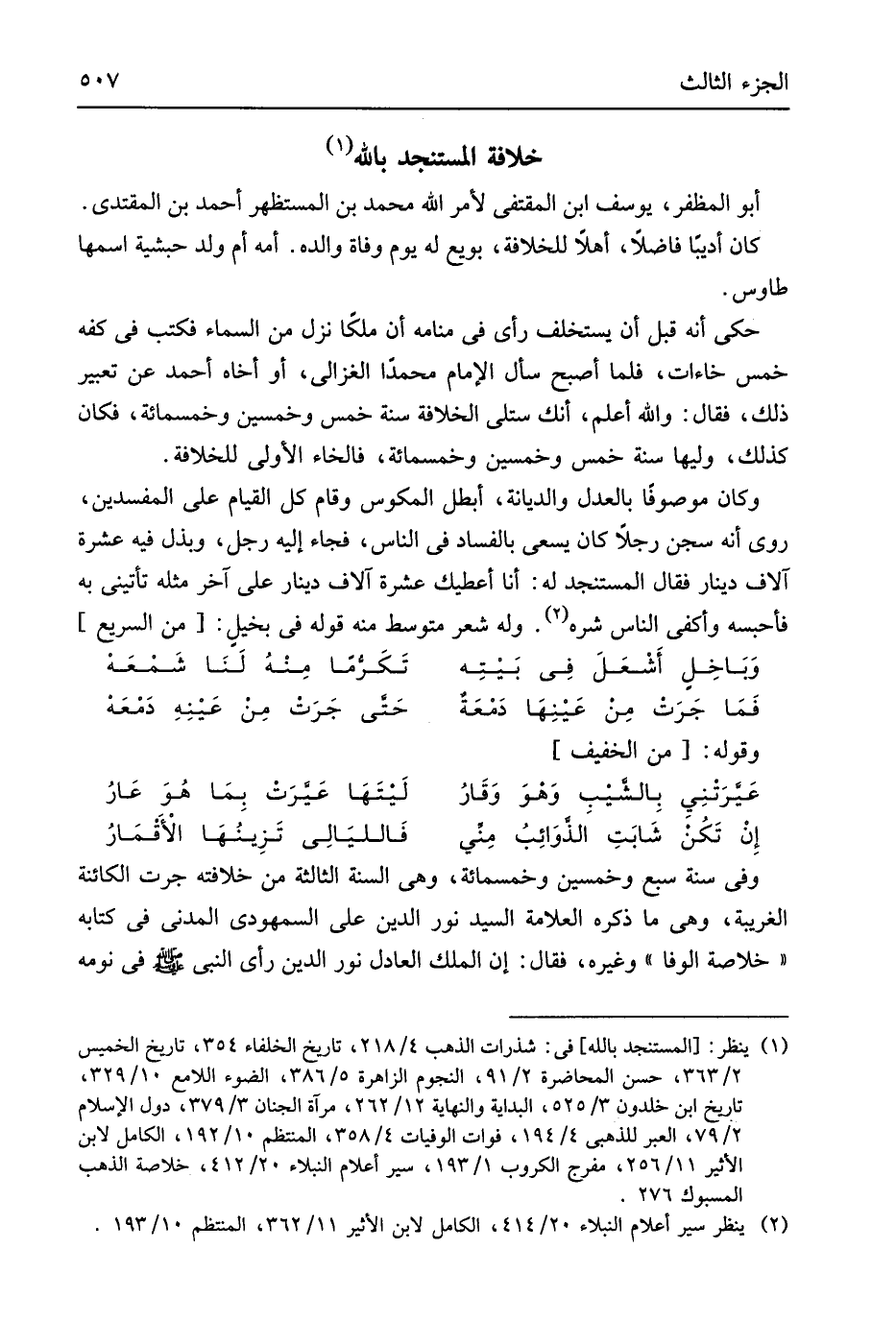 أَبُو المظفر يُوسُف ابْن المقتفي لأمر الله مُحَمَّد بن المستظهر أَحْمد بن الْمُقْتَدِي كَانَ أديباً فَاضلا أَهلا للخلافة بُويِعَ لَهُ يَوْم وَفَاة وَالِده أمه أم ولد حبشية اسْمهَا طَاوس حكى أَنه قبل أَن يسْتَخْلف رأى فِي مَنَامه أَن ملكا نزل من السَّمَاء فَكتب فِي كَفه خمس خاءات فَلَمَّا أصبح سَأَلَ الإِمَام مُحَمَّدًا الْغَزالِيّ أَو أَخَاهُ أَحْمد عَن تَعْبِير ذَلِك فَقَالَ وَالله أعلم أَنَّك ستلي الْخلَافَة سنة خمس وَخمسين وَخَمْسمِائة فَكَانَ كَذَلِك وَليهَا سنة خمس وَخمسين وَخَمْسمِائة فالخاء الأولى للخلافة وَكَانَ مَوْصُوفا بِالْعَدْلِ والديانة أبطل المكوس وَقَامَ كل الْقيام على المفسدين روى أَنه سجن رجلا كَانَ يسْعَى بِالْفَسَادِ فِي النَّاس فجَاء إِلَيْهِ رجل وبذل فِيهِ عشرَة آلَاف دِينَار فَقَالَ المستنجد لَهُ أَنا أُعْطِيك عشرَة آلف دِينَار على آخر مثله تَأتِينِي بِهِ فأحبسه وأكفي النَّاس شَره وَله شعر متوسط مِنْهُ قَول فِي الْبُخْل // (من السَّرِيع) //