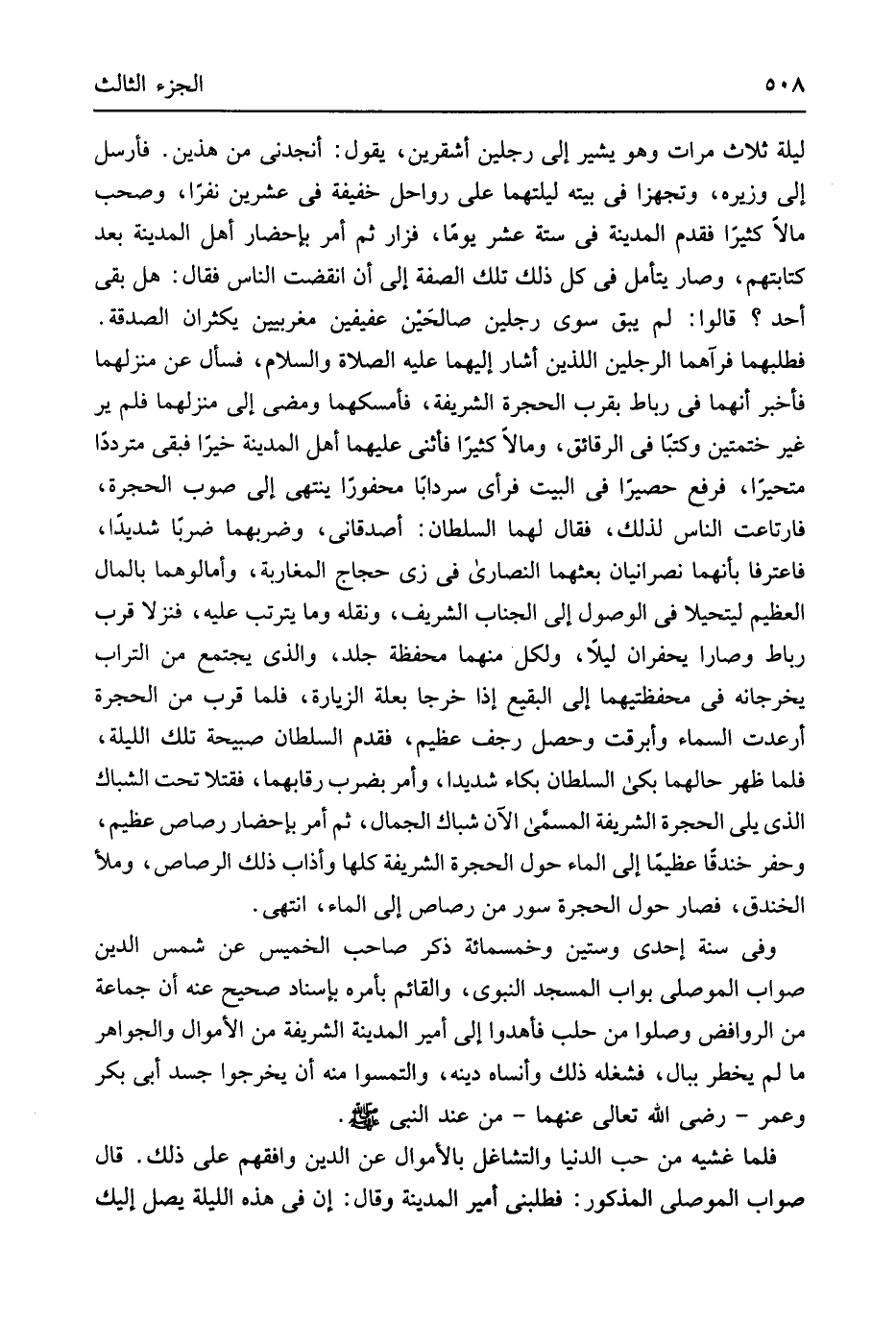 لَيْلَة ثَلَاث مَرَّات وَهُوَ يُشِير إِلَى رجلَيْنِ أشقرين يَقُول أنجدني من هذَيْن فَأرْسل إِلَى وزيره وتجهزا فِي بَيته ليلتهما على رواحل خَفِيفَة فِي عشْرين نَفرا وَصَحب مَالا كثيرَاً فَقدم الْمَدِينَة فِي سِتَّة عشر يومَاً فزار ثمَّ أَمر بإحضار أهل الْمَدِينَة بعد كتابتهم وَصَارَ يتَأَمَّل فِي كل ذَلِك تِلْكَ الصّفة إِلَى أَن انْقَضتْ النَّاس فَقَالَ هَل بَقِي أحد قَالُوا لم يبْق سوى رجلَيْنِ صالحَين عفيفين مغربيين يكثران الصَّدَقَة فطلبهما فرآهما الرجلَيْن اللَّذين أَشَارَ إِلَيْهِمَا عَلَيْهِ الصَّلَاة وَالسَّلَام فَسَأَلَ عَن منزلهما فَأخْبر أَنَّهُمَا فِي رِبَاط بِقرب الْحُجْرَة الشَّرِيفَة فَأَمْسَكَهُمَا وَمضى إِلَى منزلهما فَلم ير غير ختمتين وكتباً فِي الرَّقَائِق ومالا كثيرَاً فَأثْنى عَلَيْهِمَا أهل الْمَدِينَة خيرا فبقى متردداً متحيراً فَرفع حَصِيرا فِي الْبَيْت فَرَأى سرداباً محفوراً يَنْتَهِي إِلَى صوب الْحُجْرَة فارتاعت النَّاس لذَلِك فَقَالَ لَهما السُّلْطَان أصدقاني وضربهما ضربا شَدِيدا فاعترفا بِأَنَّهُمَا نصرانيان بعثهما النَّصَارَى فِي زِيّ حجاج المغاربة وأمالوهما بِالْمَالِ الْعَظِيم ليتحيلا فِي الْوُصُول إِلَى الجناب الشريف وَنَقله وَمَا يَتَرَتَّب عَلَيْهِ فَنزلَا قرب رِبَاطًا وصارا يحفران ليلاَ وَلكُل مِنْهُمَا محفظة جلد وَالَّذِي يجْتَمع من التُّرَاب يخرجانه فِي محفظتيهما إِلَى البقيع إِذا خرجا بعلة الزِّيَارَة فَلَمَّا قرب من الْحُجْرَة أرعدت السَّمَاء وأبرقت وَحصل رجف عَظِيم فَقدم السُّلْطَان صَبِيحَة تِلْكَ اللَّيْلَة فَلَمَّا ظهر حَالهمَا بَكَى السُّلْطَان بكاء شَدِيدا وَأمر بِضَرْب رقابهما فقتلا تَحت الشباك الَّذِي يَلِي الْحُجْرَة الشَّرِيفَة الْمُسَمّى الْآن شباك الْجمال ثمَّ أَمر بإحضار رصاص عَظِيم وحفر خَنْدَقًا عظيمَاً إِلَى المَاء حول الْحُجْرَة الشَّرِيفَة كلهَا وأذاب ذَلِك الرصاص وملأ الخَنْدَق فَصَارَ حول الْحُجْرَة سور من رصاص إِلَى المَاء انْتهى وَفِي سنة إِحْدَى وَسِتِّينَ وَخَمْسمِائة ذكر صَاحب الْخَمِيس عَن شمس الدّين صَوَاب الْموصِلِي بواب الْمَسْجِد النَّبَوِيّ والقائم بأَمْره بِإِسْنَاد صَحِيح عَنهُ أَن جمَاعَة من الروافض وصلوا من حلب فأهدوا إِلَى أَمِير الْمَدِينَة الشَّرِيفَة من الْأَمْوَال والجواهر مَا لم يخْطر ببال فَشَغلهُ ذَلِك وأنساه دينه والتمسوا مِنْهُ أَن يخرجُوا جَسَد أبي بكر وَعمر رَضِي الله عَنْهُمَا من عِنْد النَّبِي