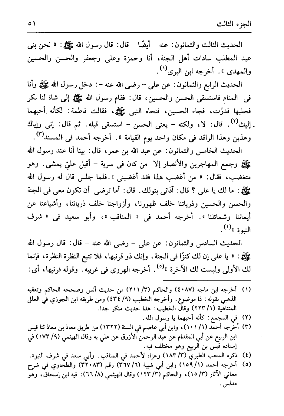 مَا لَك يَا عَليّ قَالَ أذاني بتولك قَالَ أما ترْضى أَن تكون معي فِي الْجنَّة وَالْحسن وَالْحُسَيْن وَذُرِّيَّاتنَا خلف ظُهُورنَا وَأَزْوَاجنَا خلف ذرياتنا وأشياعنا عَن أَيْمَاننَا وَشَمَائِلنَا أخرجه أَحْمد فِي المناقب وَأَبُو سعيد فِي شرف النُّبُوَّة الحَدِيث السَّادِس وَالثَّمَانُونَ