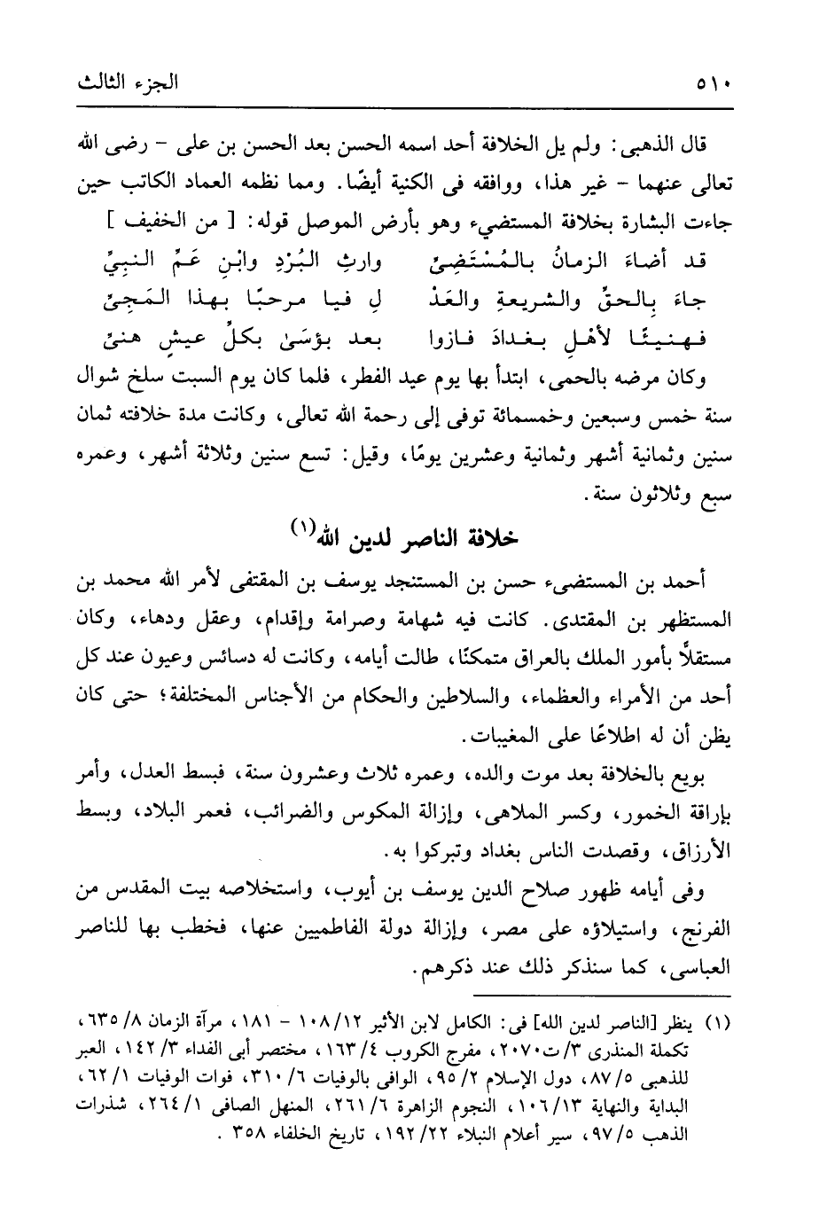 أَحْمد بن المستضيء حسن بن المستنجد يُوسُف بن المقتفي لأمر الله مُحَمَّد بن المستظهر بن الْمُقْتَدِي كَانَت فِيهِ شهامة وصرامة وإقدام وعقل ودهاء وَكَانَ مستقلاُّ بِأُمُور الْملك بالعراق مُتَمَكنًا طَالَتْ أَيَّامه وَكَانَت لَهُ دسائس وعيون عِنْد كل أحد من الْأُمَرَاء والعظماء والسلاطين والحكام من الْأَجْنَاس الْمُخْتَلفَة حَتَّى كَانَ يظنّ أَن لَهُ اطلاعاً على المغيبات بُويِعَ بالخلافة بعد موت وَالِده وعمره ثَلَاث وَعِشْرُونَ سنة فَبسط الْعدْل وَأمر بإراقة الْخُمُور وَكسر الملاهي وَإِزَالَة المكوس والضرائب فعمر الْبِلَاد وَبسط الأرزاق وقصدت النَّاس بَغْدَاد وتبركوا بِهِ وَفِي أَيَّامه ظُهُور صَلَاح الدّين يُوسُف بن أَيُّوب واستخلاصه بَيت الْمُقَدّس من الفرنج واستيلاؤه على مصر وَإِزَالَة دولة الفاطميين عَنْهَا فَخَطب بهَا للناصر العباسي كَمَا سنذكر ذَلِك عِنْد ذكرهم