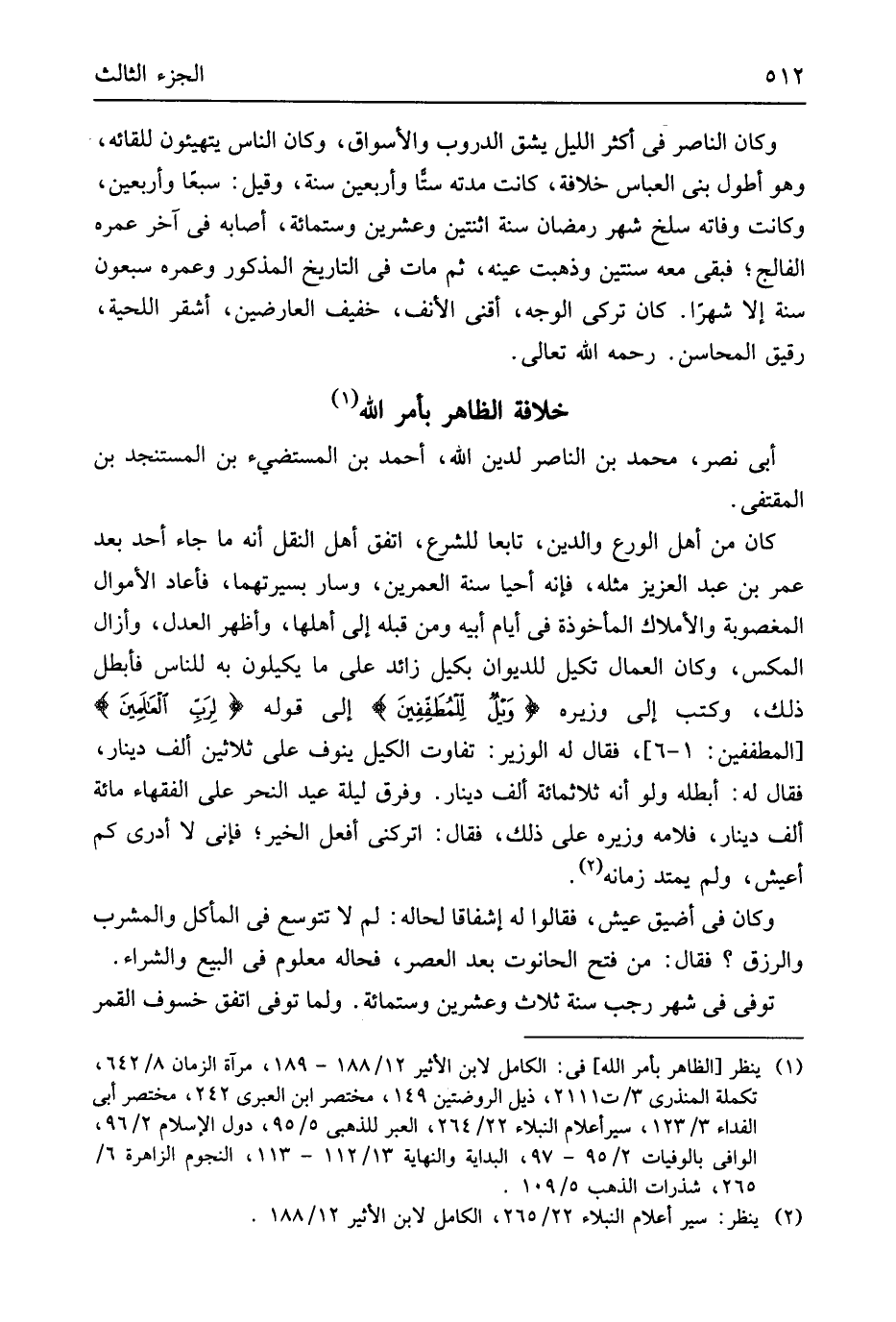 أبي نصر مُحَمَّد بن النَّاصِر لدين الله أَحْمد بن المستضيء بن المستنجد بن المقتفي كَانَ من أهل الْوَرع وَالدّين تَابعا للشَّرْع اتّفق أهل النَّفْل أَنه مَا جَاءَ أحد بعد عمر بن عبد الْعَزِيز مثله فَإِنَّهُ أَحْيَا سنة العمرين وَسَار بسيرتهما فَأَعَادَ الْأَمْوَال الْمَغْصُوبَة والأملاك الْمَأْخُوذَة فِي أَيَّام أَبِيه وَمن قبله إِلَى أَهلهَا وَأظْهر الْعدْل وأزال المكس وَكَانَ الْعمَّال تكيل للديوان يَكِيل زَائِد على مَا يكيلون بِهِ للنَّاس فَأبْطل ذَلِك وَكتب إِلَى وزيره {وَيل للمُطَفِفِينَ} إِلَى قَوْله {لِرَبِ اَلعَاَلمِينَ} المطففين 1 - 6 فَقَالَ لَهُ الْوَزير تفَاوت الْكَيْل ينوف على ثَلَاثِينَ ألف دِينَار فَقَالَ لَهُ أبْطلهُ وَلَو أَنه ثَلَاثمِائَة ألف دِينَار وَفرق لَيْلَة عيد النَّحْر على الْفُقَهَاء مائَة ألف دِينَار فلامه وزيره على ذَلِك فَقَالَ اتركني أفعل الْخَيْر فَإِنِّي لَا أَدْرِي كم أعيش وَلم يَمْتَد زَمَانه وَكَانَ فِي أضق عَيْش فَقَالُوا لَهُ إشفاقاً لحاله لم لَا تتوسع فِي المأكل وَالْمشْرَب والرزق فَقَالَ من فنح الْحَانُوت بعد الْعَصْر فحاله مَعْلُوم فِي البيع وَالشِّرَاء توفّي فِي شهر رَجَب سنة ثَلَاث وَعشْرين وسِتمِائَة وَلما توفّي اتّفق خُسُوف الْقَمَر