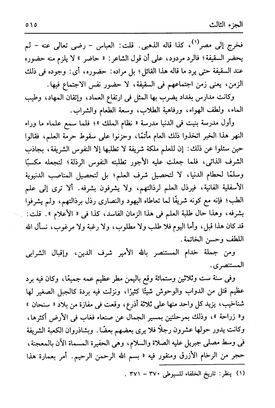 فَخرج إِلَى مصر كَذَا قَالَه الذَّهَبِيّ قلت الْعَبَّاس رَضِي تَعَالَى عَنهُ لم يحضر السَّقِيفَة فالرد مَرْدُود على أَن قَول الشَّاعِر حَاضر لَا يلْزم مِنْهُ حُضُوره عِنْد السَّقِيفَة حَتَّى يرد مَا قَالَه هَذَا الْقَائِل بل مُرَاده حُضُوره أَي وجوده فِي ذَلِك الزَّمن يَعْنِي زمن اجْتِمَاعهم فِي السَّقِيفَة لَا حُضُور نفس الِاجْتِمَاع فِيهَا وَكَانَت مدارس بَغْدَاد يضْرب بهَا الْمثل فِي ارْتِفَاع الْعِمَاد وإتقان المهاد وَطيب المَاء ولطف الْهَوَاء ورفاهية الطلاب وسعة الطَّعَام وَالشرَاب وَأول مدرسة بنيت فِي الدُّنْيَا مدرسة نظام الْملك فَلَمَّا سمع عُلَمَاء مَا وَرَاء النَّهر هَذَا الْخَبَر اتَّخذُوا ذَلِك الْعَام مأتماً وحزنوا على سُقُوط حُرْمَة الْعلم فَقَالُوا حِين سئلوا عَن ذَلِك إِن للْعلم ملكة شريفة لَا تطلبها إِلَّا النُّفُوس الشَّرِيفَة بجاذب الشّرف الذاتي فَلَمَّا جعلت عَلَيْهِ الأجور تطلبته النُّفُوس الرذلة لتجعله مكسباً وسلمَا لحطام الدُّنْيَا لَا لتَحْصِيل شرف الْعلم بل لتَحْصِيل المناصب الدُّنْيَوِيَّة الأسفلية الفانية فيرذل الْعلم لرذالتهم وَلَا يشرفون بشرفه أَلا ترى إِلَى علم الطِّبّ فَإِنَّهُ مَعَ كَونه شريفاً لما تعاطاه الْيَهُود وَالنَّصَارَى رذل برذالتهم وَلم يشرفوا بشرفه وَهَذَا حَال طلبة الْعلم فِي هَذَا الزَّمَان الْفَاسِد كَذَا فِي الْأَعْلَام قلت قد كَانَ هَذَا قبل وَأما الْيَوْم فَلَا طلب وَلَا مَطْلُوب وَلَا رَغْبَة وَلَا مَرْغُوب نسْأَل الله اللطف وَحسن الخاتمة وَمن جملَة خدام الْمُسْتَنْصر بِاللَّه الْأَمِير شرف الدّين وإقبال الشرابي المستنصري وَفِي سنة سِتّ وَثَلَاثِينَ وسِتمِائَة وَقع بِالْيمن مطر عَظِيم عَمه جميعَاً وَكَانَ فِيهِ برد عَظِيم قتل من الدَّوَابّ والوحوش شَيْئا كثيرا وَنزلت فِيهِ بردة كالجبل الصَّغِير لَهَا شناخيب يزِيد كل وَاحِد مِنْهَا على ثَلَاثَة أَذْرع وَقعت فِي مفازة من بِلَاد سنحان وزراحة وَذَلِكَ بمرحلتين بمسير الْجمال عَن صنعاء فَغَاب فِي الأَرْض أَكْثَرهَا وَكَانَت يَدُور حولهَا عشرُون رجلا فَلَا يرى بَعضهم يعضا وبشاذروان الْكَعْبَة الشَّرِيفَة فِي وسط مصلى جِبْرِيل عَلَيْهِ الصَّلَاة وَالسَّلَام وَهِي الحفيرة الْمُسَمَّاة الآَن بالمعجنة حجر من الرخام الْأَزْرَق ومنقور فِيهِ بِسم الله الرَّحْمَن الرَّحِيم أَمر بعمارة هَذَا