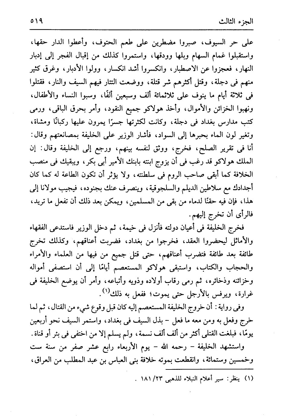 على حر السيوف صَبَرُوا مضطرين على طعم الحتوف وأعطوا الدَّار حَقّهَا واستقبلوا غمام السِّهَام وبلها وودقها واستمروا كَذَلِك من إقبال الْفجْر إِلَى إدبار النَّهَار فعجزوا عَن الاصطبار وانكسروا أَشد انكسار وولوا الأدبار وغرق كثير مِنْهُم فِي دجلة وَقتل أَكْثَرهم شَرّ قتلة وَوضعت التتار فيهم السَّيْف وَالنَّار فَقتلُوا فِي ثَلَاثَة أَيَّام مَا ينوف على ثَلَاثمِائَة ألف وَسبعين ألفا وَسبوا النِّسَاء والأطفال ونهبوا الخزائن وَالْأَمْوَال وَأخذ هولاكو جَمِيع النُّقُود وَأمر بحرق الْبَاقِي وَرمى كتب مدارس بَغْدَاد فِي دجلة وَكَانَت لكثرتها جِسْرًا يَمرونَ عَلَيْهَا ركبانَاً وَمُشَاة وَتغَير لون المَاء بحبرها إِلَى السوَاد فَأَشَارَ الْوَزير على الْخَلِيفَة بمصانعتهم وَقَالَ أَنا فِي تَقْرِير الصُّلْح فَخرج ووثق لنَفسِهِ بَينهم وَرجع إِلَى الْخَلِيفَة وَقَالَ إِن الْملك هولاكو قد رغب فِي أَن يُزَوّج ابْنَته بابنك الْأَمِير أبي بكر ويبقيك فِي منصب الْخلَافَة كَمَا أبقى صَاحب الرّوم فِي سلطنته وَلَا يُؤثر أَن تكون الطَّاعَة لَهُ كَمَا كَانَ أجدادك مَعَ سلاطين الديلم والسلجوقية وينصرف عَنْك بجُنُوده فيجيب مَوْلَانَا إِلَى هَذَا فَإِن فِيهِ حَقنا لدماء من بَقِي من الْمُسلمين وَيُمكن بعد ذَلِك أَن تفعل مَا تُرِيدُ فَالرَّأْي أَن تخرج إِلَيْهِم فَخرج الْخَلِيفَة فِي أَعْيَان دولته فَأنْزل فِي خيمة ثمَّ دخل الْوَزير فاستدعى الْفُقَهَاء والأماثل ليحضروا العقد فَخَروا من بَغْدَاد فَضربت أَعْنَاقهم وَكَذَلِكَ تخرج طَائِفَة بعد طَائِفَة فَتضْرب أَعْنَاقهم حَتَّى قتل جَمِيع من فِيهَا من الْعلمَاء والأمراء والحجاب وَالْكتاب واستبقى هولاكو المستعصم أَيَّامًا إِلَى أَن استصفي أَمْوَاله وخزائنه وذخائره ثمَّ رمى رِقَاب أَوْلَاده وَذَوِيهِ وَأَتْبَاعه وَأمر أَن يوضع الْخَلِيفَة فِي غرارة ويرفس بالأرجل حَتَّى يَمُوت فَفعل بِهِ ذَلِك وَفِي رِوَايَة أَن خُرُوج الْخَلِيفَة المستعصم إِلَيْهِ كَانَ قبل وُقُوع شَيْء من الْقِتَال ثمَّ لما خرج وَفعل بِهِ وَمن مَعَه مَا فعل بذل السَّيْف فِي بَغْدَاد وَاسْتمرّ السَّيْف نَحْو أَرْبَعِينَ يَوْمًا فبلغت الْقَتْلَى أَكثر من ألف ألف نسمَة وَلم يسلم إِلَّا من اختفى فِي بِئْر أَو قناة وَاسْتشْهدَ الْخَلِيفَة رَحمَه الله يَوْم الْأَرْبَعَاء رَابِع عشر صفر من سنة سِتّ وَخمسين وسِتمِائَة وانقطعت بِمَوْتِهِ خلَافَة بني الْعَبَّاس بن عبد الْمطلب من الْعرَاق