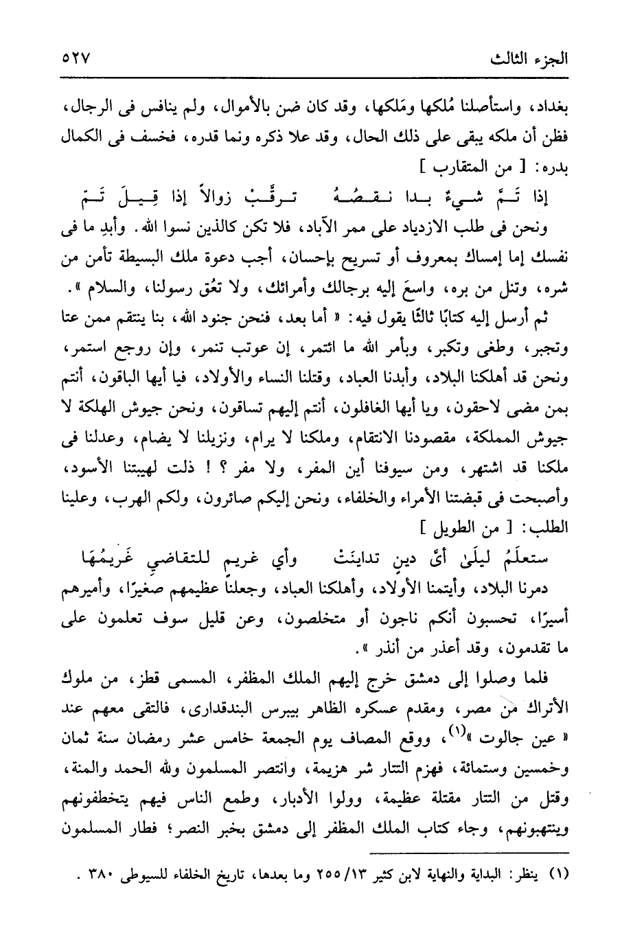وَنحن فِي طلب الازدياد على ممر الآباد فَلَا تكن كَالَّذِين نسوا الله وأبدِ مَا فِي نَفسك إِمَّا إمْسَاك بِمَعْرُوف أَو تَسْرِيح بِإِحْسَان أجب دَعْوَة البسيطة تأمن من شَره وتنل من بره واسعَ إِلَيْهِ برجالك وأمرائك وَلَا تعُق رَسُولنَا وَالسَّلَام ثمَّ أرسل إِلَيْهِ كتابا ثَالِثا قَول فِيهِ أما بعد فَنحْن جنود الله بِنَا ينْتَقم مِمَّن عتا وتجبر وطغى وتكبر وبأمر الله مَا ائتمر إِن عوتب تنمر وَإِن رُوجِعَ اسْتمرّ وَنحن قد أهلكنا الْبِلَاد وأبدنا الْعباد وقتلنا النِّسَاء وَالْأَوْلَاد فيا أَيهَا الْبَاقُونَ أَنْتُم بِمن مضى لاحقون وَيَا أَيهَا الغافلون أَنْتُم إِلَيْهِم تساقون وَنحن جيوش الهلكة لَا جيوش المملكة مقصودنا الانتقام وملكنا لَا يرام ونزيلنا لَا يضام وعدلنا فِي ملكنا قد اشْتهر وَمن سُيُوفنَا أَيْن المفر وَلَا مفر ذلت لهيبتنا الْأسود وأصبحت فِي قبضتنا الْأُمَرَاء وَالْخُلَفَاء وَنحن إِلَيْكُم صائرون وَلكم الْهَرَب وعلينا الطّلب من // (الطَّوِيل) //