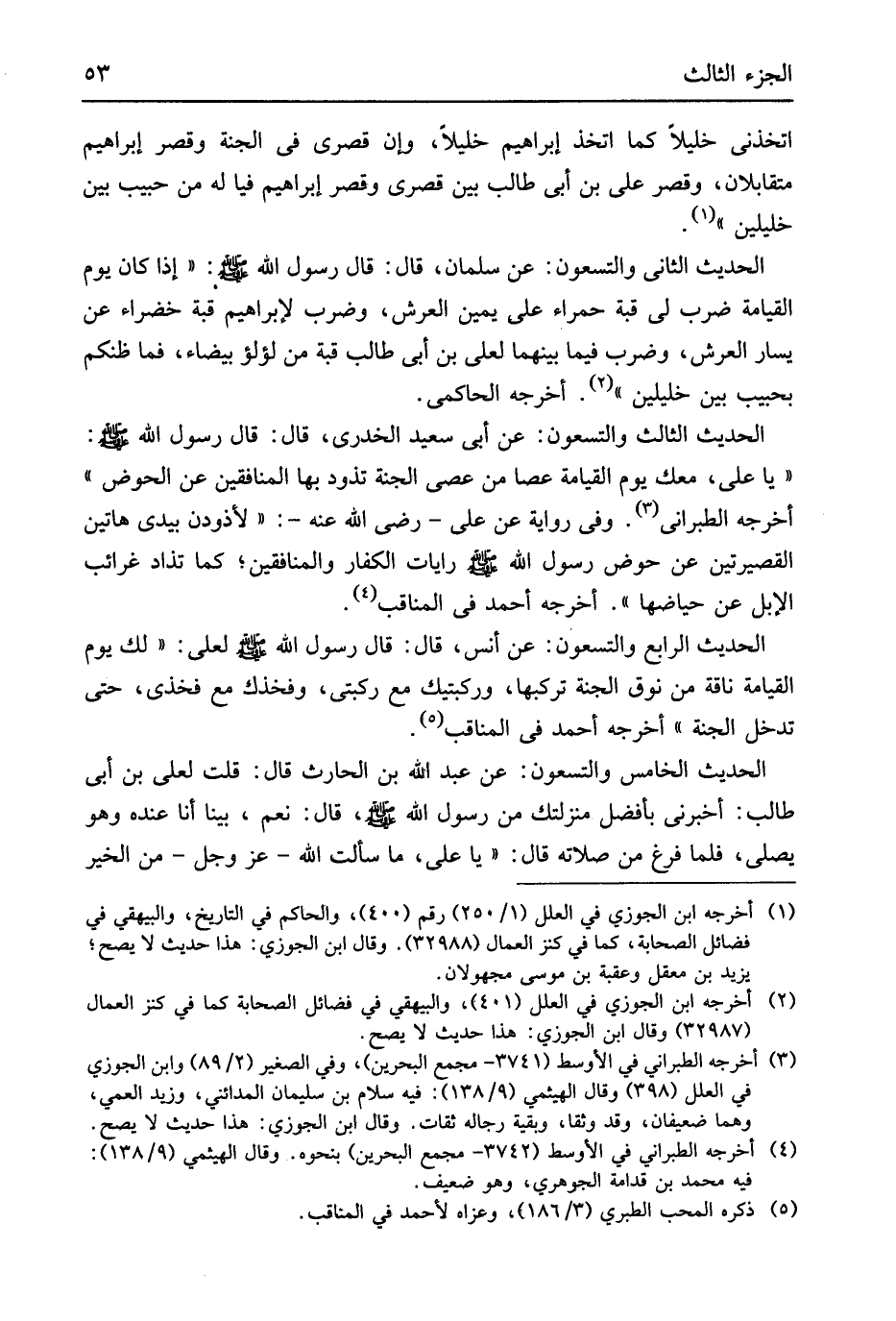 إِذا كَانَ يَوْم الْقِيَامَة ضرب لي قبَّة حَمْرَاء على يَمِين الْعَرْش وَضرب لإِبْرَاهِيم قبَّة خضراء عَن يسَار الْعَرْش وَضرب فِيمَا بَينهمَا لعَلي بن أبي طَالب قبَّة من لُؤْلُؤ بَيْضَاء فَمَا ظنكم بحبيب بَين خليلين أخرجه الحاكمي الحَدِيث الثَّالِث وَالتِّسْعُونَ