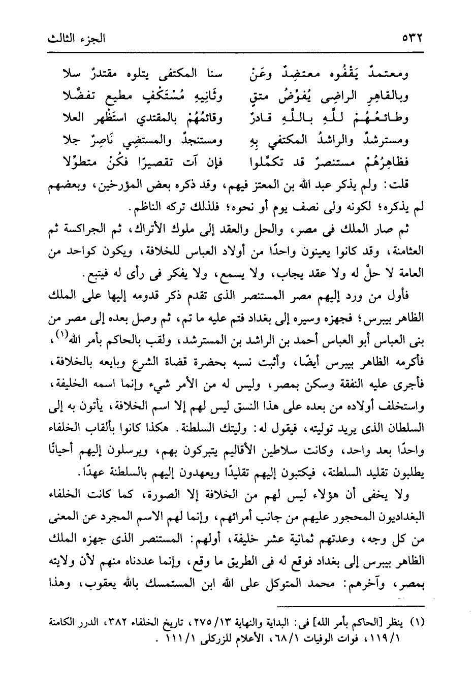 قلت وَلم يذكر عبد الله بن المعتز فيهم وَقد ذكره بعض المؤرخين وَبَعْضهمْ لم يذكرهُ لكَونه ولي نصف يَوْم أَو نَحوه فَلذَلِك تَركه النَّاظِم ثمَّ صَار الْملك فِي مصر والحل وَالْعقد إِلَى مُلُوك الأتراك ثمَّ الجراكسة ثمَّ العثامنة وَقد كَانُوا يعينون وَاحِدًا من أَوْلَاد الْعَبَّاس للخلافة وَيكون كواحد من الْعَامَّة لَا حل لَهُ وَلَا عقد يُجَاب وَلَا يسمع وَلَا يفكر فِي رَأْي لَهُ فَيتبع فَأول من ورد إِلَيْهِم مصر الْمُسْتَنْصر الَّذِي تقدم ذكر قدومه إِلَيْهَا على الْملك الظَّاهِر بيبرس فجهزه وسيره إِلَى بَغْدَاد فتم عَلَيْهِ مَا تمّ ثمَّ وصل بعده إِلَى مصر من بني الْعَبَّاس أَبُو الْعَبَّاس أَحْمد بن الراشد بن المسترشد ولقب بالحاكم بِأَمْر الله فَأكْرمه الظَّاهِر بيبرس أَيْضا وَأثبت نسبه بِحَضْرَة قُضَاة الشَّرْع وَبَايَعَهُ بالخلافة فَأجرى عَلَيْهِ النَّفَقَة وَسكن بِمصْر وَلَيْسَ لَهُ من الْأَمر شَيْء وَإِنَّمَا اسْمه الْخَلِيفَة واستخلف أَوْلَاده من بعده على هَذَا النسق لَيْسَ لَهُم إِلَّا اسْم الْخلَافَة يأْتونَ بِهِ إِلَى السُّلْطَان الَّذِي يُرِيد تَوليته فَيَقُول لَهُ وليتك السلطنة هَكَذَا كَانُوا بألقاب الْخُلَفَاء وَاحِدًا بعد وَاحِد وَكَانَت سلاطين الأقاليم يتبركون بهم ويرسلون إِلَيْهِم أَحْيَانًا يطْلبُونَ تَقْلِيد السلطنة فيكتبون إِلَيْهِم تقليدَاً ويعهدون إِلَيْهِم بالسلطنة عهدا وَلَا يخفى أَن هَؤُلَاءِ لَيْسَ لَهُم من الْخلَافَة إِلَّا الصُّورَة كَمَا كَانَت الْخُلَفَاء البغداديون الْمَحْجُور عَلَيْهِم من جَانب أمرائهم وَإِنَّمَا لَهُم الِاسْم الْمُجَرّد عَن الْمَعْنى من كل وَجه وعدتهم ثَمَانِيَة عشر خَليفَة أَوَّلهمْ الْمُسْتَنْصر الَّذِي جهزه الْملك الظَّاهِر بيبرس إِلَى بَغْدَاد فَوَقع لَهُ فِي الطَّرِيق مَا وَقع وَإِنَّمَا عدناه مِنْهُم لِأَن ولَايَته بِمصْر وَآخرهمْ مُحَمَّد المتَوَكل على الله ابْن المستمسك بِاللَّه يَعْقُوب وَهَذَا